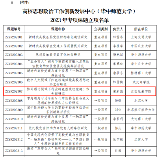 新闻中心讯 近日,教育部高校思想政治工作创新发展中心(华中师范大学)公布了《关于2023年专项课题立项的公示》,我校党委副书记唐新强主持申报的课题《协同理论视域下行业特色型院校党建工作创新研究》(课题编号:ZZYR202307)成功立项重点项目。