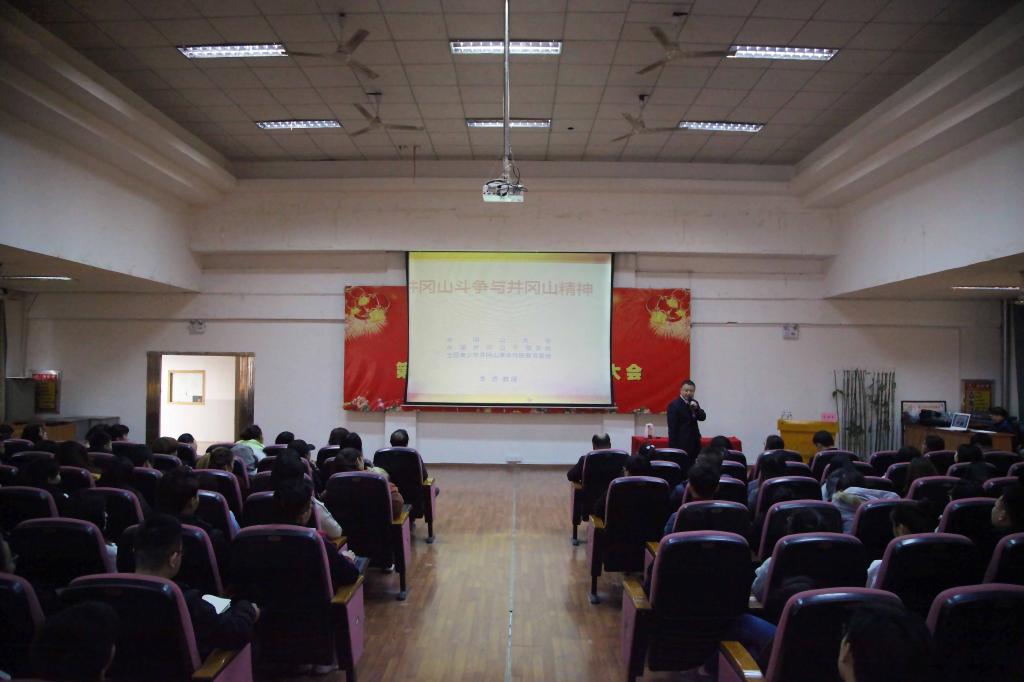 李忠教授以“井冈山斗争与井冈山精神”为主题,结合视频、图片、实物,以故事化的形式,顺着历史脉络,详细介绍了井冈山根据地从建立、全盛、曲折发展的斗争历程。深刻阐述了井冈山精神的丰富内涵:坚定不移的革命信念,坚持党的绝对领导,密切联系人民群众的思想作风,一切从实际出发的思想路线,艰苦奋斗的作风。讲座中他多次深情吟唱红歌民谣,让现场聆听讲座的师生深深感受到老一辈无产阶级革命家和红军将士及井冈山人民革命理想高于天、革命乐观主义、军民鱼水情深等动人情景。情之所至,李教授几度哽咽,师生也自发的伴着歌声打着节拍。最后他以《光荣岁月》这首诗作为结语,激励我校师生坚定信仰、追求理想,希望同学们今后能够勤于学习,善于总结。讲座过程中掌声不断、精彩不断。李忠教授声情并茂、诙谐幽默,全方位多角度为我校师生带来的不仅是一堂生动的信念教育课,更是一顿红色精神大餐,对帮助我校师生更好的理解了中国人民从站起来、富起来到强起来的艰苦奋斗历程,珍惜美好幸福生活,进一步坚定师生党员和入党积极分子的理想信念,加强党性修养,不忘初心,牢记使命,传承红色精神,勤奋工作,刻苦学习,为实现中华民族伟大复兴的中国梦接续奋斗有着重要的教育意义。