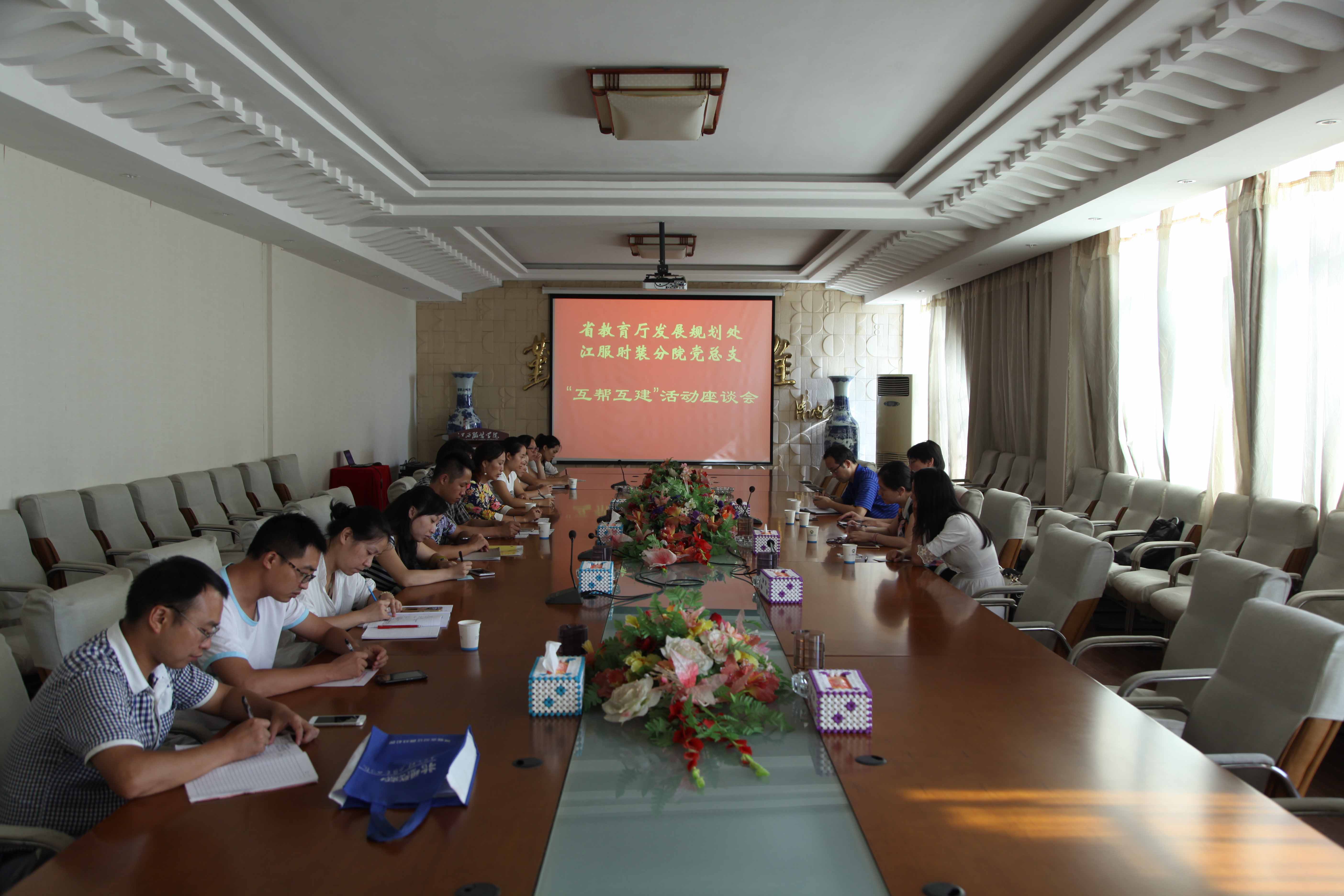 期间,在行政楼二楼会议室举行了座谈交流。会上,党委工作部部长陈水生代表学校致欢迎词,并简要介绍了学院基层党组织建设情况。时装设计分院党总支书记曹华就分院基本概况、党总支的建设情况、支部建设中开展的工作、当前面临的困难及需要提供的帮助等几个方面做了全面的汇报。沈栩主任代表发展规划处党支部就此行考察交流的目的和教育厅发展规划处的基本概况等作了简要介绍,对我校的建设发展和党建工作予以了高度肯定,并表示,发展规划处将全力支持我校党建工作。他表示,此次座谈交流只是“互帮互建”活动的开始,今后双方要共同用好这个平台和载体,多开展一些有益活动,做到互相促进,共同提高,进一步加强支部“互帮互建”,推动双方党建工作又好又快地发展。