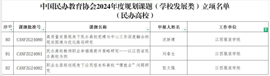 新闻中心讯 7月10日,中国民办教育协会公布了2024年度规划课题(学校发展类)立项名单。我校教师沈新建、刘春生、张文强主持的课题获批立项。