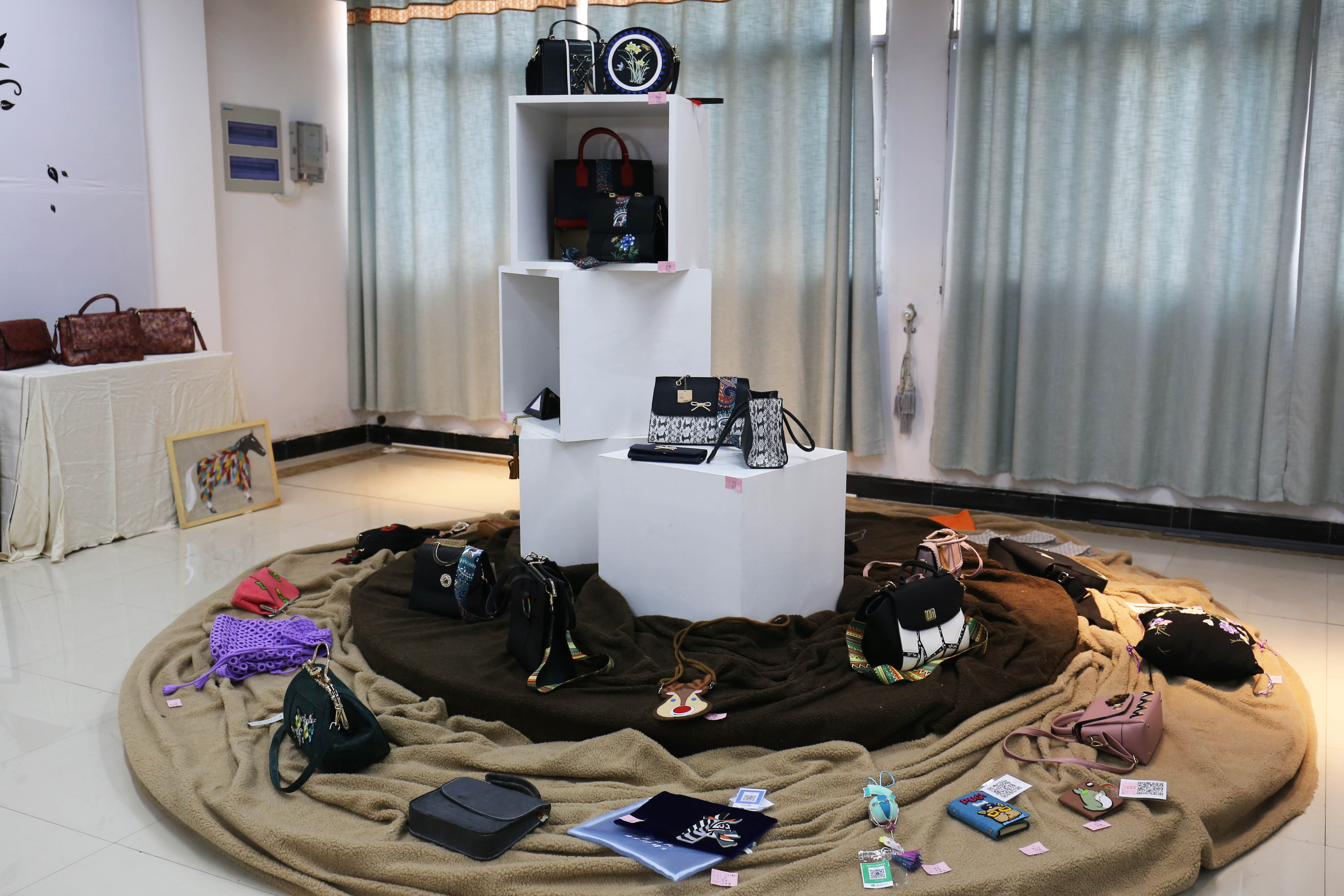 进入展厅,琳琅满目的手工饰品展现在眼前,时尚、新殷、充满作者独特设计风格的女士包包,精美又不失大方的首饰,外表的精致、纯手工打造的银项圈都让人眼前一亮,令人纷纷驻足观看。各具特色的服饰品效果图及手工服饰品极具艺术风格,具有很强的实用性,贴近市场。