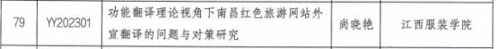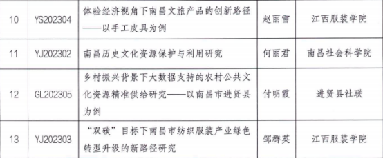 赵丽雪老师申报的课题《体验经济视角下南昌文旅产品的创新路径-以手工皮具为例》、邹群英老师申报的课题《“双碳”目标下南昌市纺织服装产业绿色转型升级的新路径研究》、尚晓艳老师申报的课题《功能翻译理论视角下南昌红色旅游网站外宣翻译的问题与对策研究》成功入选市级立项项目。