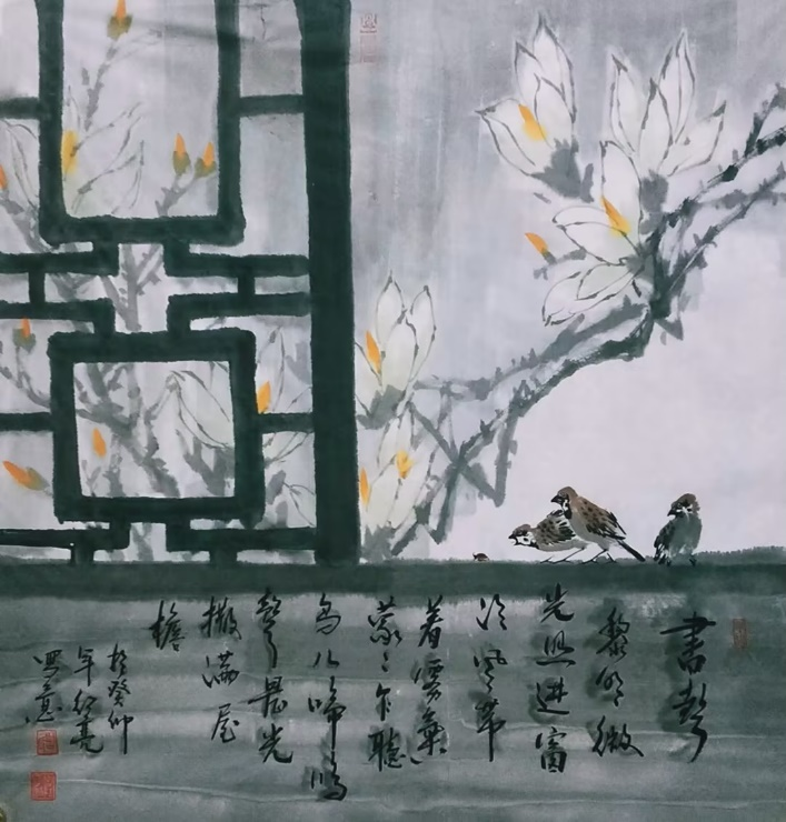 此次展出的作品中,由艺术设计学院教师周红亮创作的《江服春韵图》被推荐为2023年高校“礼敬中华优秀传统文化”宣传教育活动成果展览作品。《江服春韵图》以现实主义的创作手法,反映了万象城平台仲春时节校园一角玉兰花开的景色,彰显了学校励精图治、蓬勃向上的校园文化,寓意着万象城平台30多年来扎根于纺织服装行业,办学蒸蒸日上,就如同这校园春色一般,生机盎然。
