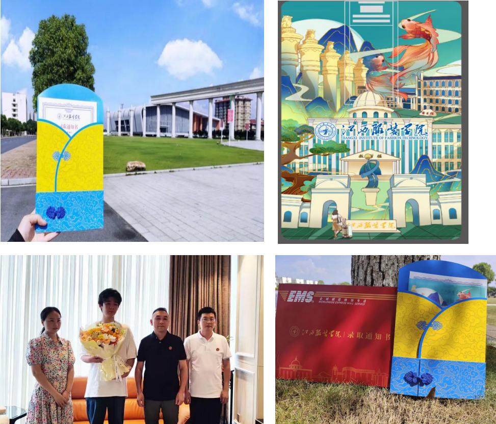 今年的新生录取通知书继续采用了在校学生文创比赛的方式遴选,以中式传统服装为基底配以传统服装中使用的盘扣为纽带,体现中华传统服饰的多彩文化,传递了在校生对新生的美好祝福,承载了学校对新加入江服大家庭的殷切期盼。