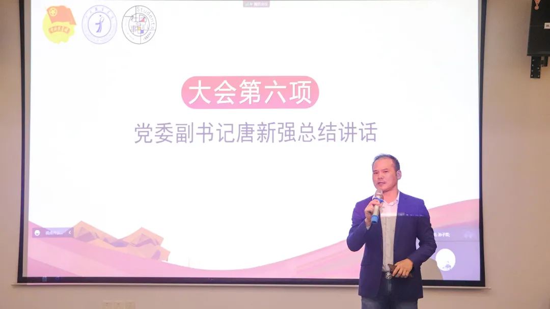 会上,校党委副书记唐新强为获奖社团颁奖并作总结讲话。他首先带领大家回顾了我校社团建设的发展历程。他指出,学生社团是学校育人工作的重要平台,对拓展学生眼界和能力、充实学生社会体验和丰富学生生活十分有益。在党的二十大召开时,我们组织召开这次社团文化建设工作会议,非常及时、非常必要。学校将继续从政策、人员、经费、场地四个方面为社团建设提供保障,各社团应积极进取,扎实工作,紧抓机遇,应对挑战,以一流的业绩开创社团发展的新局面。