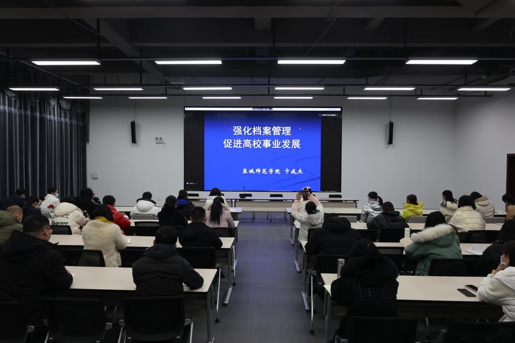 会后,盐城师范学院图书馆、档案馆馆长卞咸杰给全校兼职档案员、图书馆、档案馆工作人员作了一场题为《强化档案管理促进高校事业发展》的专题培训。培训中,卞馆长结合自身多年的档案管理工作经验,从档案与档案工作概述、纸质档案收集与整理、声像档案收集与整理、电子文件收集与整理四个方面入手,重点阐述了档案的管理、收集及整理三个重要步骤。整场培训深入浅出、系统全面、内涵丰富,既有理论高度,又有实践深度,对大家进一步提高对档案工作重要性的认识、了解档案的作用和价值、明确归档文件整理工作的具体要求起到了积极的促进作用。