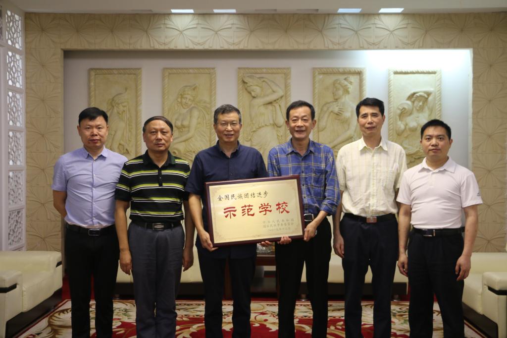 服装报讯:5月27日下午,江西省民族宗教事务局民族社会事业处处长马徽江一行将“全国民族团结进步示范学校”荣誉牌匾授予我校,校长陈万龙、党委副书记高建国、副校长胡放等代表学校接授奖牌。马徽江处长对我校民族团结进步创建工作给予了肯定,并对今后的工作提出了指导性意见。据悉,我校是江西省唯一获此殊荣的高校。