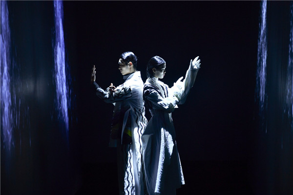 发布会以一段意味深长的全息影像震撼开场。饱满洁白的棉花与织机上千丝万缕的纱线,是服装设计的原动力;在流动色彩的背景下,即将出场的作品依次闪现;黑白场景瞬间被色彩点亮,铁轨上驶向远方的火车承载了服装人的梦想;身着华服的模特与自然景色相融,人与自然和谐共生。视频最后,江边溅起阵阵水花,水花幻化出主题“卅之舞”,汇聚于T台之上的模特。