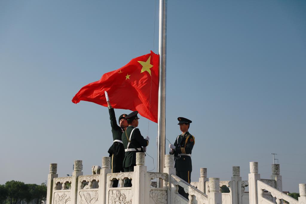迎着清晨的阳光,国旗护卫队手持国旗和钢枪,步伐整齐,军容严整,英姿飒爽,护送鲜艳的五星红旗入场。伴随着《义勇军进行曲》奏响,全体师生肃然起敬,鲜艳的五星红旗在大家注目下冉冉升起,迎风飘扬,师生深情的目光中,饱含着对祖国的无限热爱和崇高敬意。
