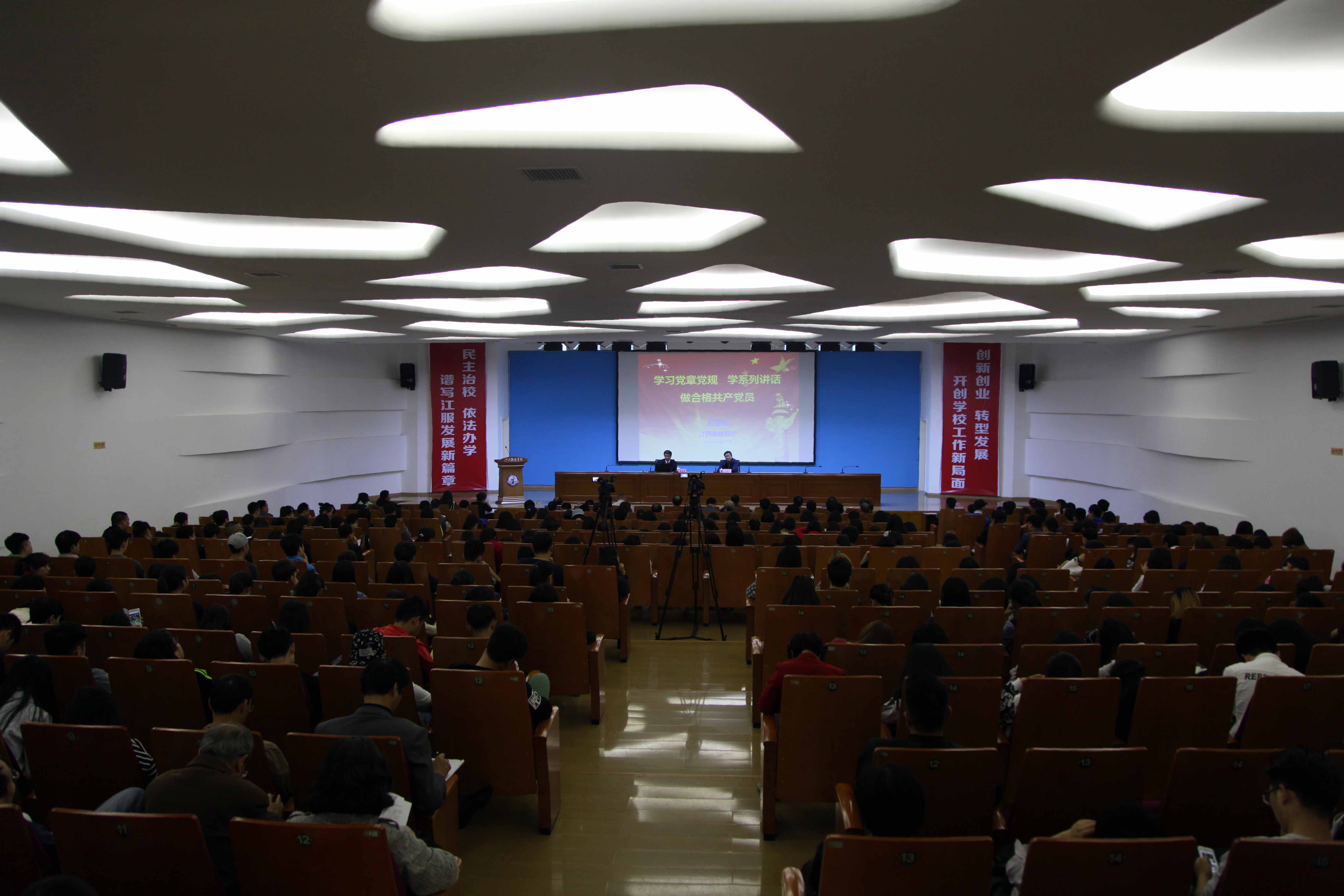 为学习贯彻落实中央《关于在全体党员中开展“学党章党规,学系列讲话,做合格党员”学习教育方案》,充分认识开展“两学一做”学习教育的重要意义,4月12日下午,万象城平台邀请省教育厅巡视员周金堂教授作“学党章党规,学系列讲话,做合格党员 ”学习教育辅导报告。报告会由督导专员、校党委书记王建元主持,校领导、全校中层干部、全体党员,教师和入党积极分子代表等500余人聆听了报告。