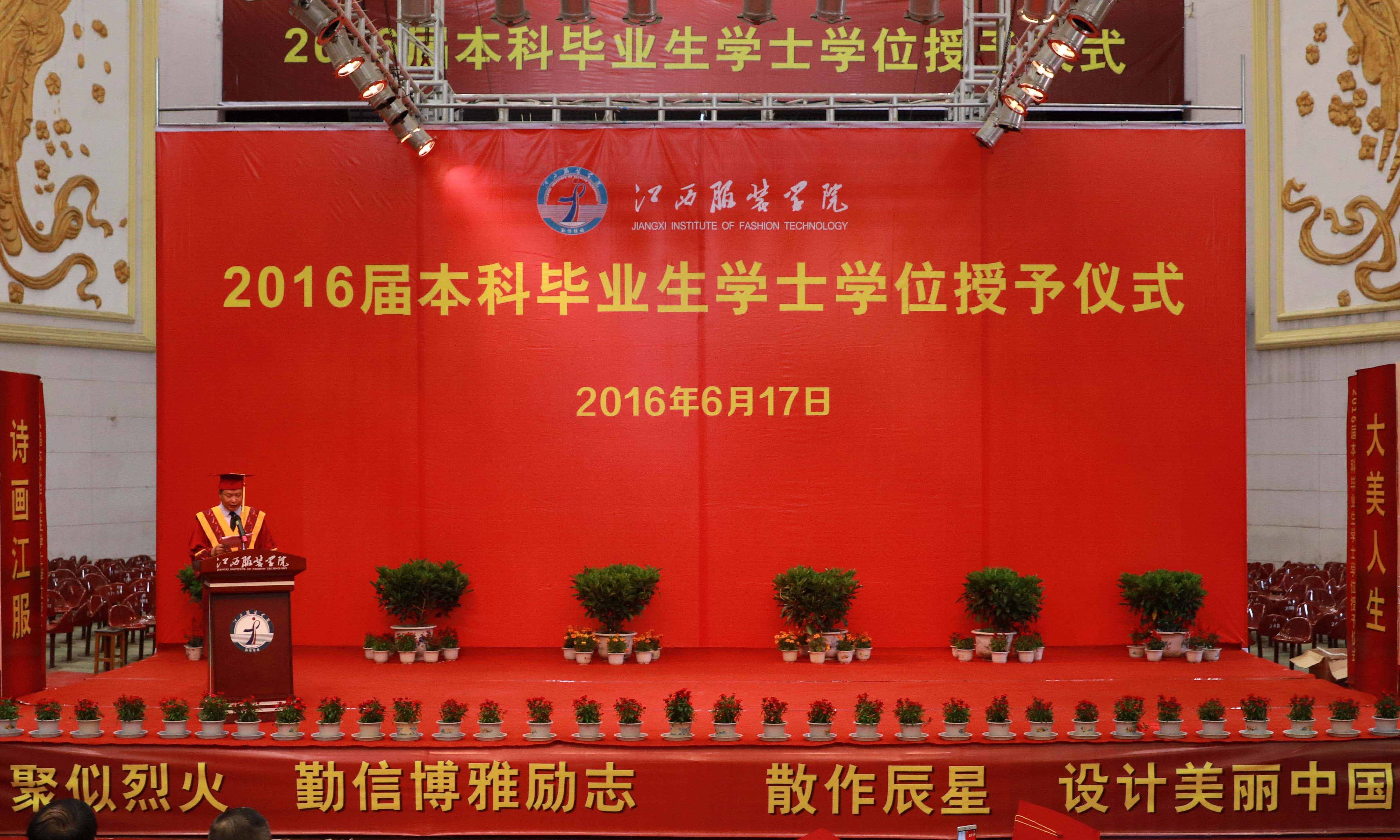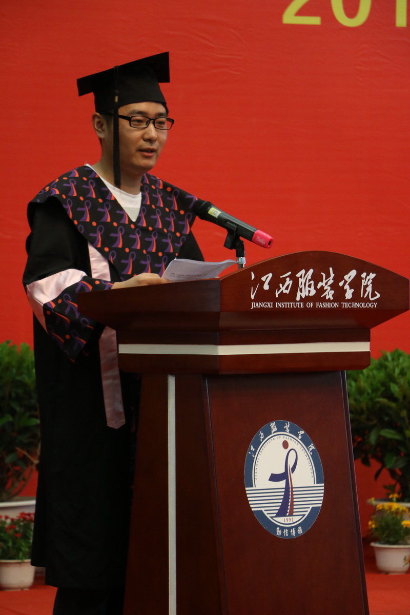 校长陈万龙代表学校和全校师生员工,向幸运而又出色的江服“黄埔二期”全体同学表示热烈的祝贺,向为同学们成长成才付出真爱、辛劳的全体教职工和各位同学的家长致以崇高的敬意。他充分肯定本届毕业生在学风建设、科技创新、校园文化建设等方面为学校的积极付出和丰硕成果,并用“昨夜西风凋碧树,独上高楼望尽天涯路”、“衣带渐宽终不悔,为伊消得人憔悴”、“众里寻她千百度,蓦然回首,那人却在灯火阑珊处”三句宋词名句与毕业生分享了人生三境界。陈万龙说,人生境界的高低,在于各自的不懈努力与修炼。毕业离校,不是学习的结束,而是在更高起点上的开始。希望同学们学以致用,把自己融入到建设服装强国的伟大事业中去,放飞梦想,坚守匠心,让青春在创意“中国品牌”、打响“中国创造”的征程中绽放异彩;希望同学们把握机遇,乘势而上,凭自己的勤奋努力和聪明才智,在创新创业的大潮中不断进取,勇于创新,成就未来;希望江服才俊,勇立潮头,创新创业,大展宏图,内心坚定,享受爱的温暖,多陪家人,多交朋友,时刻保持感恩的心态,期待江服学子笑傲“江湖”。