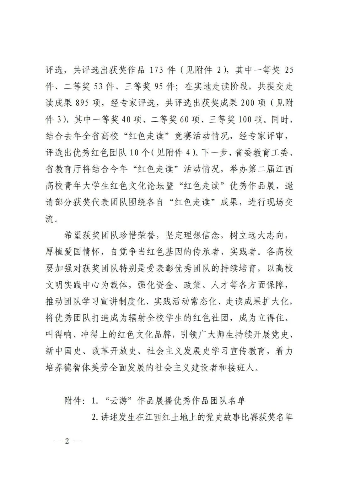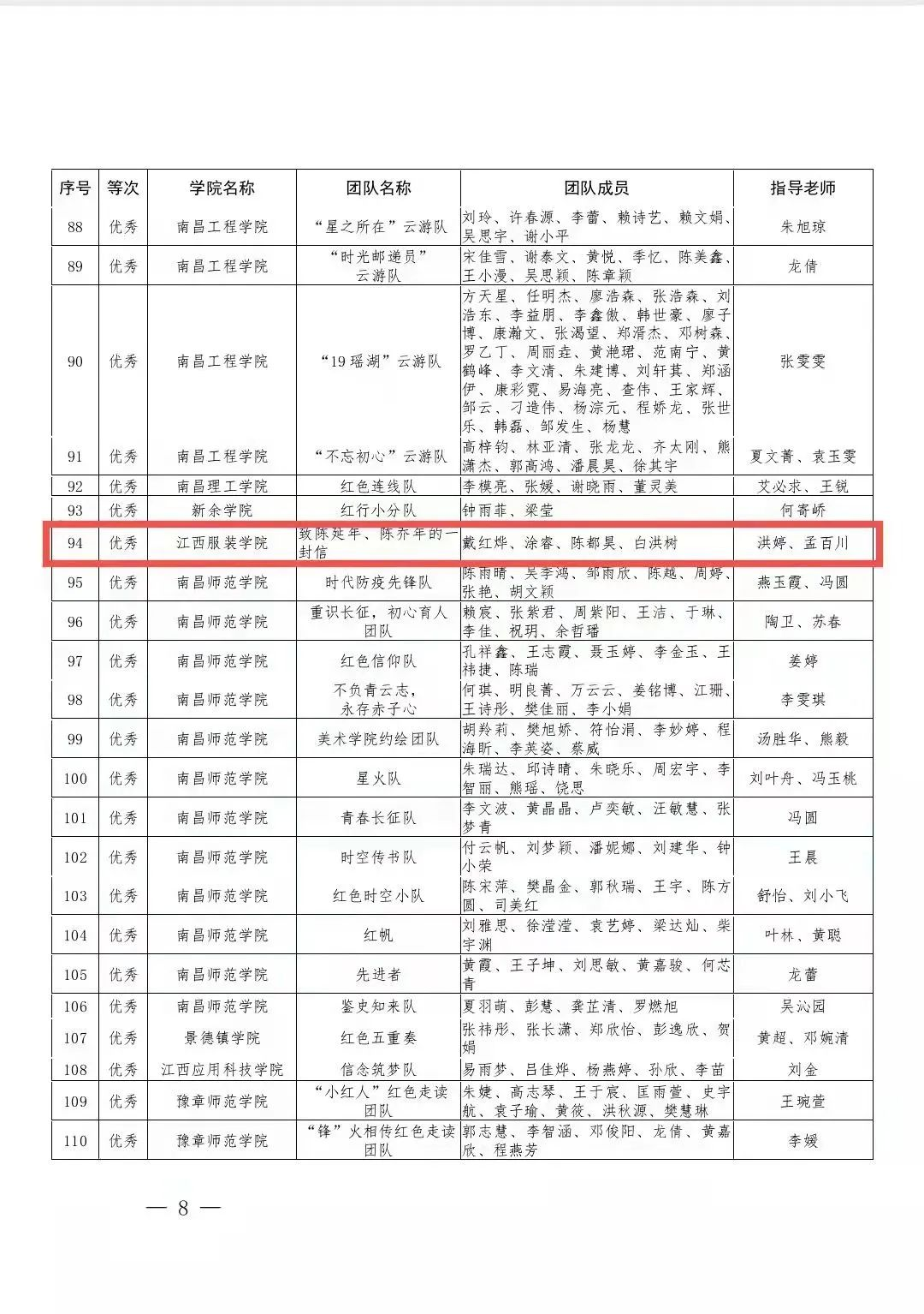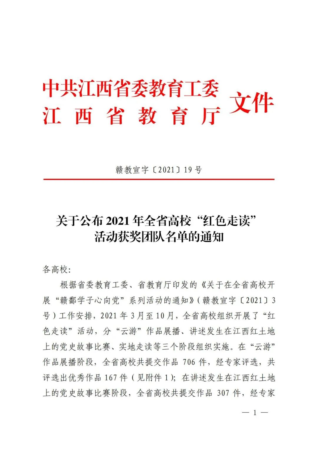 根据省委教育工委、省教育厅印发的《关于在全省高校开展“赣鄱学子心向党”系列活动的通知》(赣教宣字〔2021〕3 号)工作安排,2021 年 3 月至 10 月,全省高校组织开展了“红色走读”活动,分“云游”作品展播、讲述发生在江西红土地上的党史故事比赛、实地走读等三个阶段组织实施。在“云游” 作品展播阶段,全省高校共提交作品 706 件,经专家评选,共评选出优秀作品 167 件,我校选送的戴红烨、涂睿、陈都昊、白洪树(指导老师 洪婷 孟百川)四位同学的作品荣获2021年江西省高校“云游”作品展播优秀团队奖,为校争得荣耀。