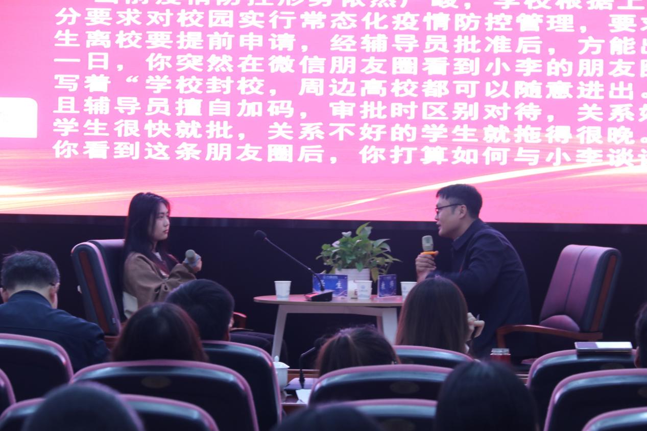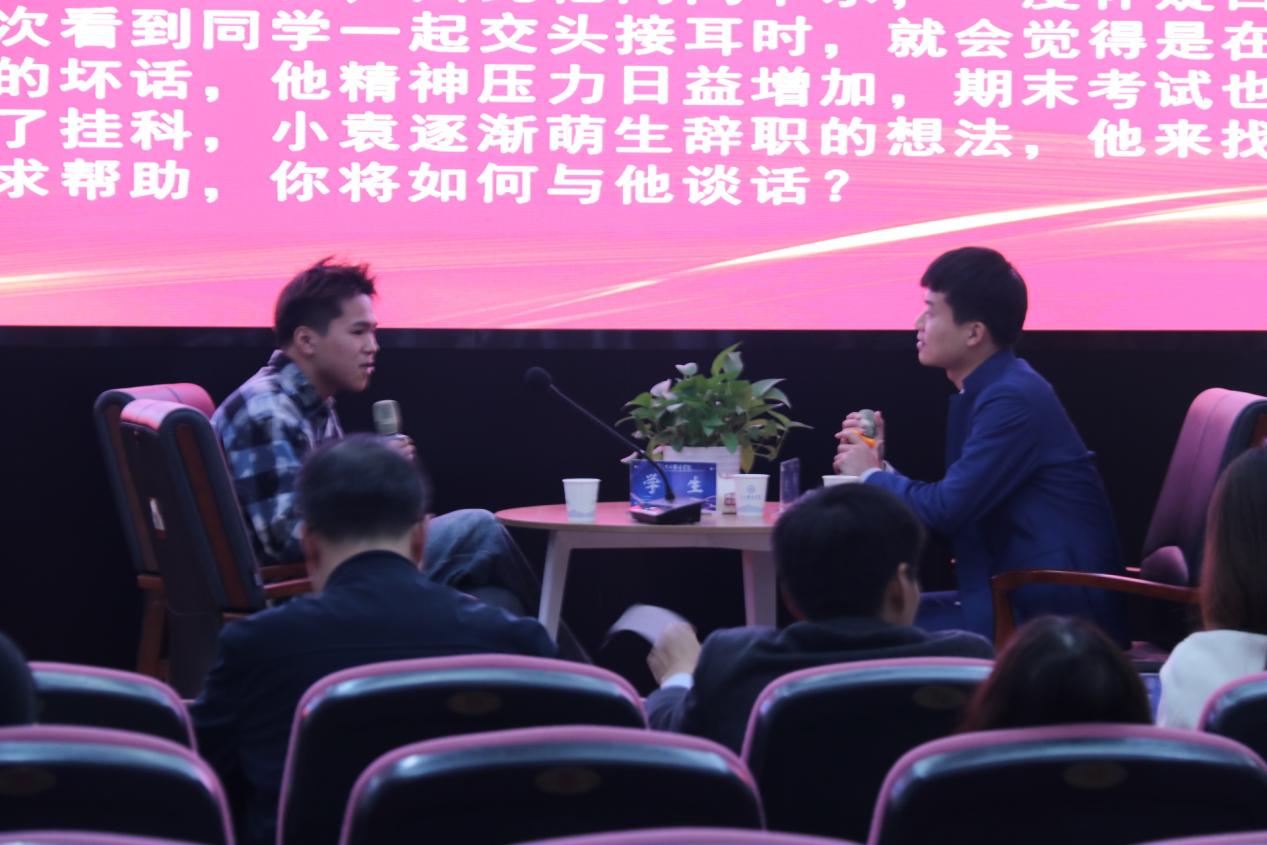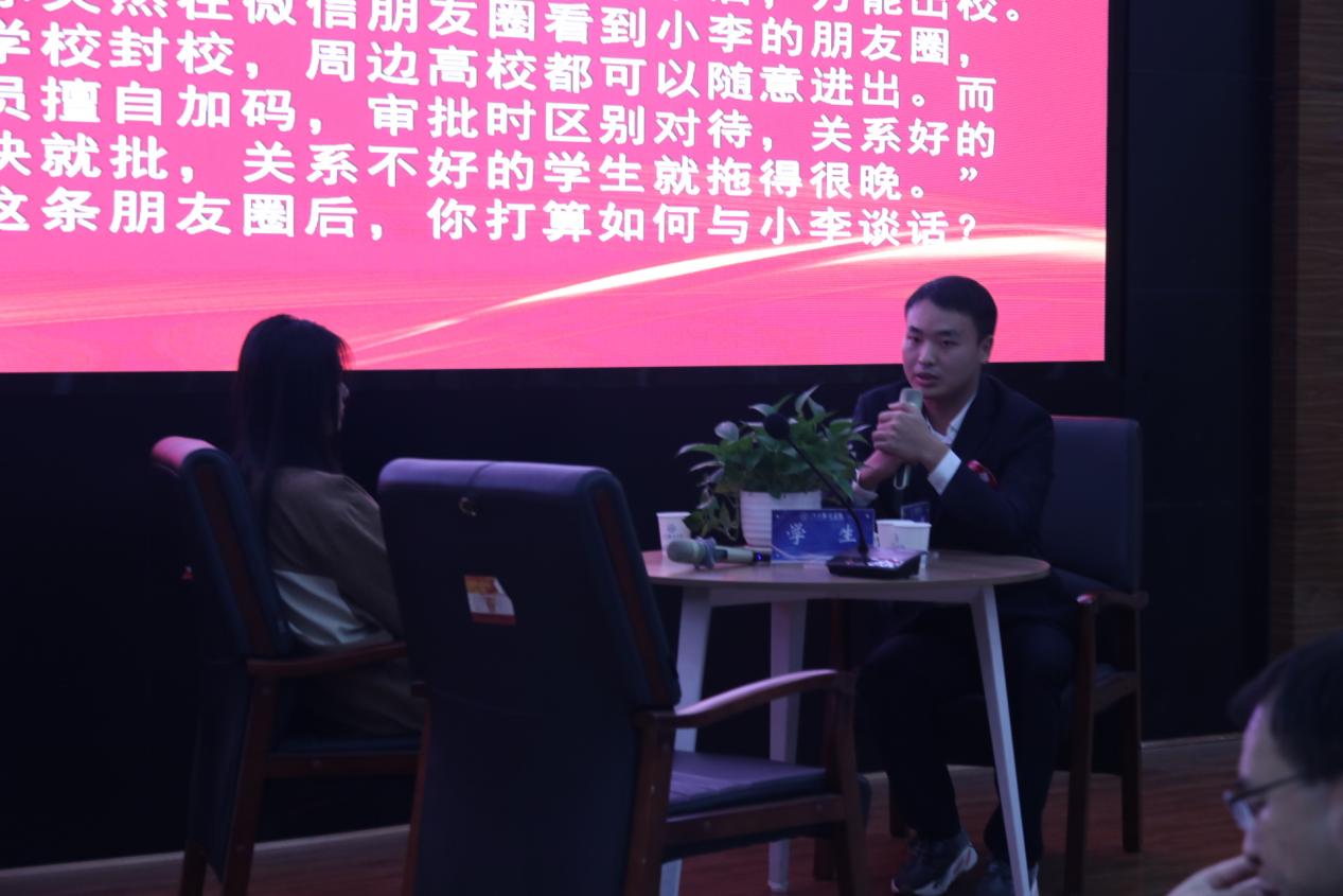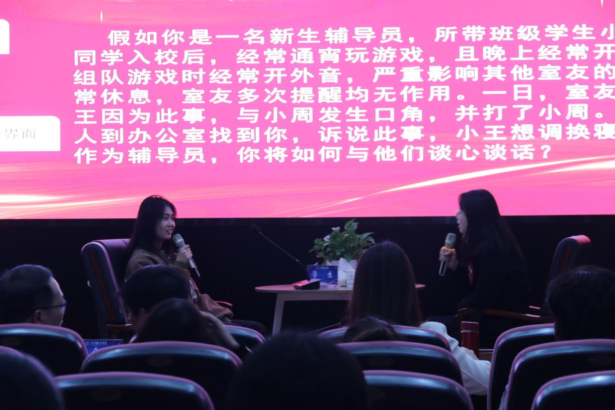 谈心谈话,主要考察辅导员对学生特征、学生成长成才规律的了解把握程度,对学生的教育引导能力、解决理论困惑和实际问题的能力等。参赛选手提前10分钟抽题,按照“人题匹配”的原则与学生开展谈心谈话。12位选手分别围绕情感困惑、疫情防控、学业压力、电信诈骗、党员发展、宿舍人际关系等话题与学生开展谈话,老师们充分运用心理学、教育学、职业发展教育等专业知识及自身工作经验进行价值引领,充分展示了辅导员扎实的政策把握能力、全面的信息分析能力与过硬的教育引导能力。比赛现场学生化身“戏精演员”,学生与老师金句频出,不时引出阵阵笑声,为比赛增添了欢乐性和趣味性。