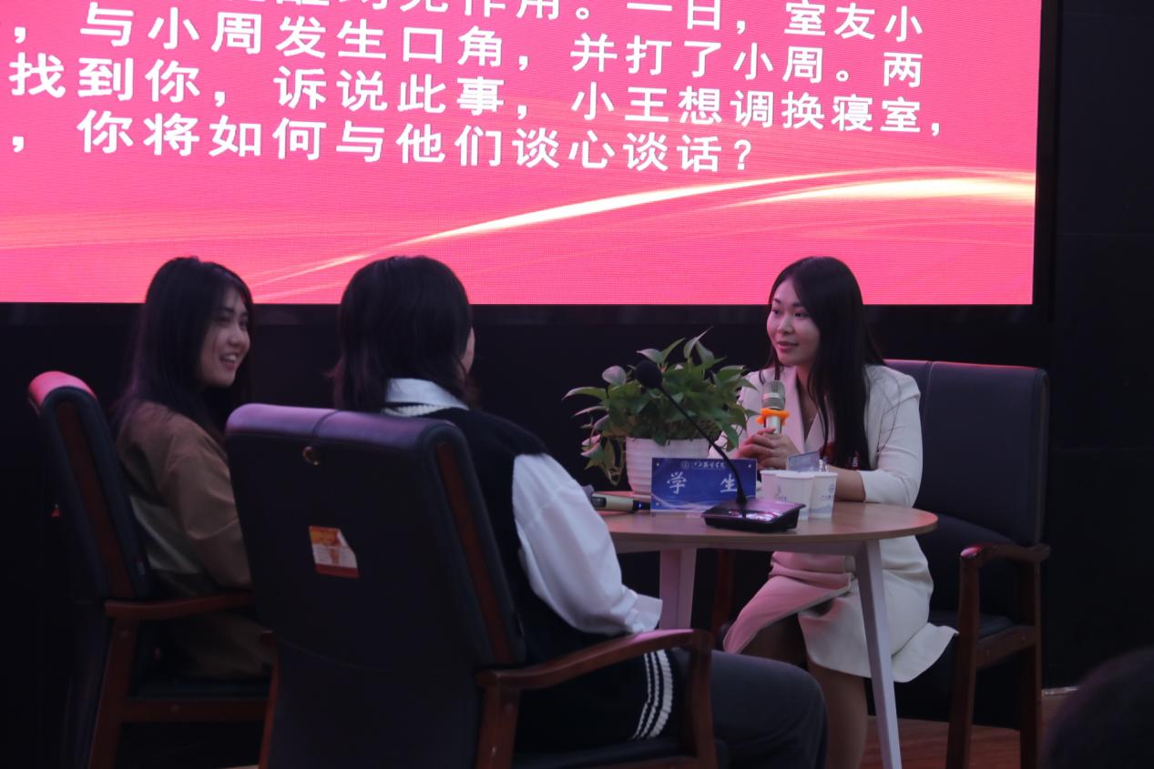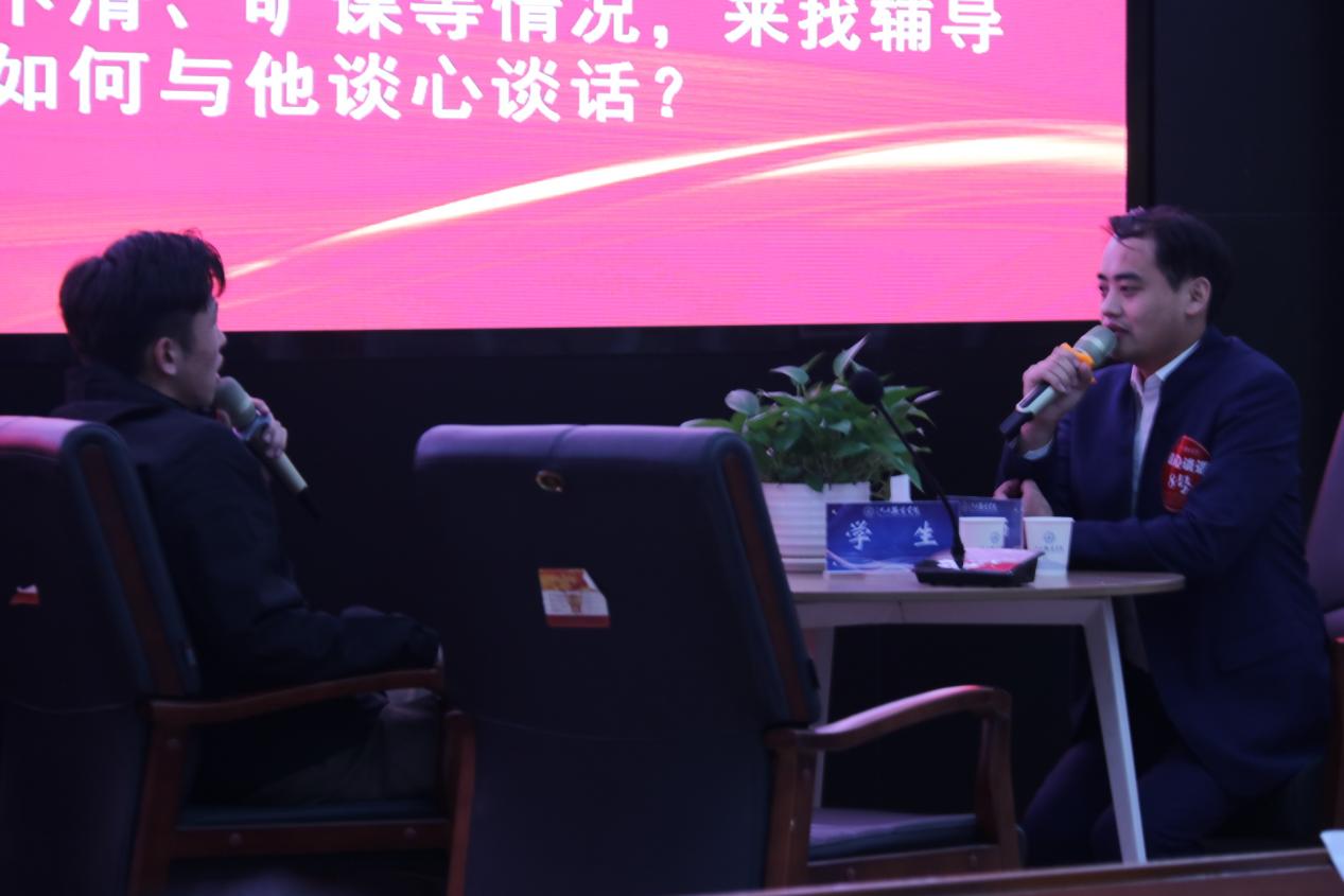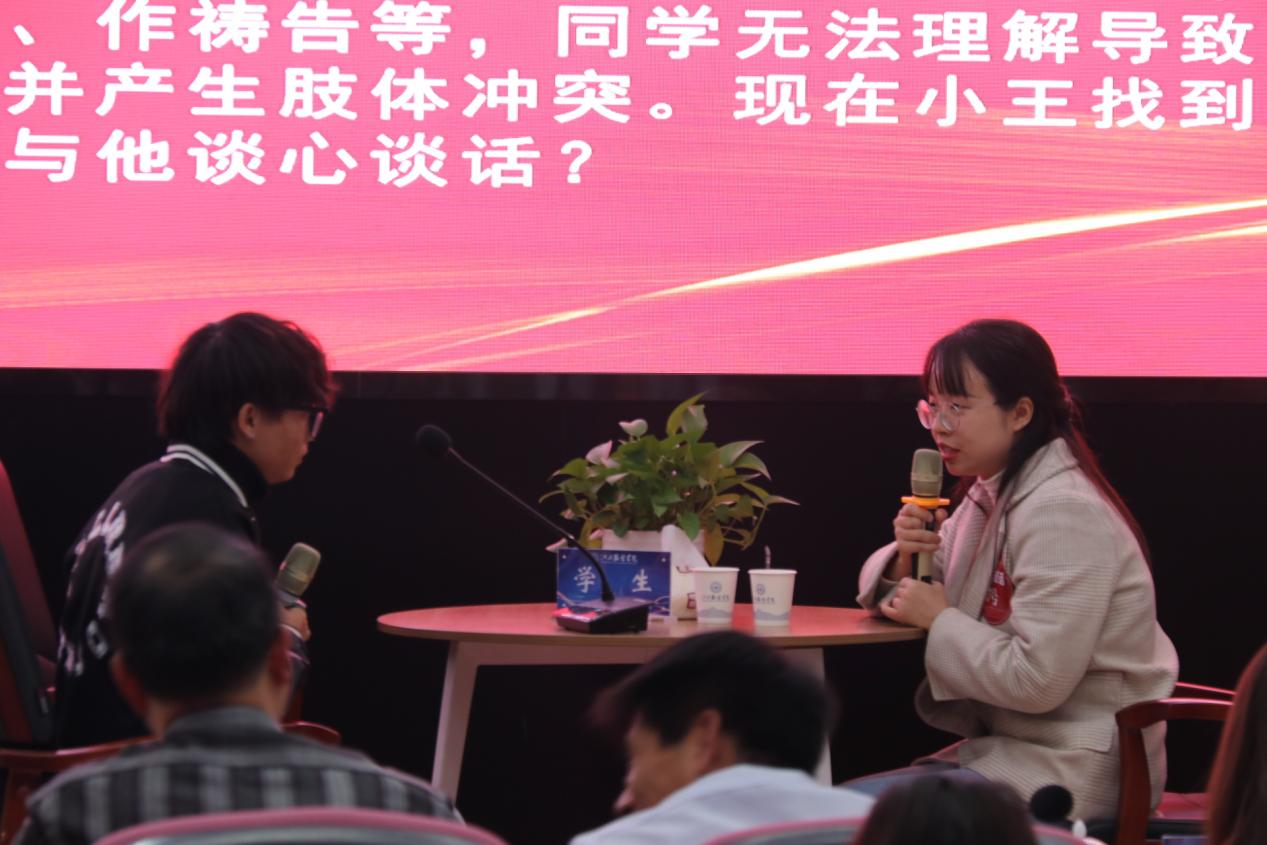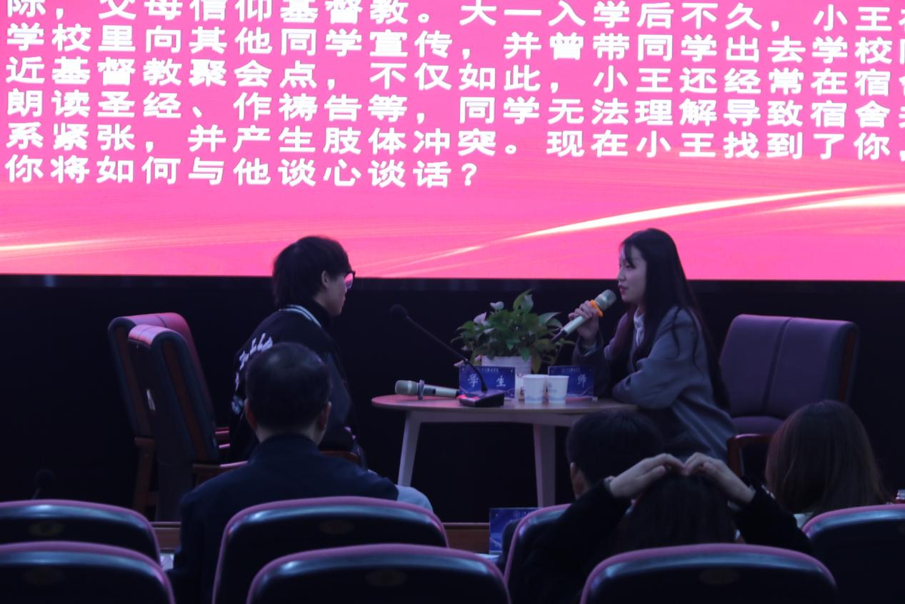 谈心谈话,主要考察辅导员对学生特征、学生成长成才规律的了解把握程度,对学生的教育引导能力、解决理论困惑和实际问题的能力等。参赛选手提前10分钟抽题,按照“人题匹配”的原则与学生开展谈心谈话。12位选手分别围绕情感困惑、疫情防控、学业压力、电信诈骗、党员发展、宿舍人际关系等话题与学生开展谈话,老师们充分运用心理学、教育学、职业发展教育等专业知识及自身工作经验进行价值引领,充分展示了辅导员扎实的政策把握能力、全面的信息分析能力与过硬的教育引导能力。比赛现场学生化身“戏精演员”,学生与老师金句频出,不时引出阵阵笑声,为比赛增添了欢乐性和趣味性。