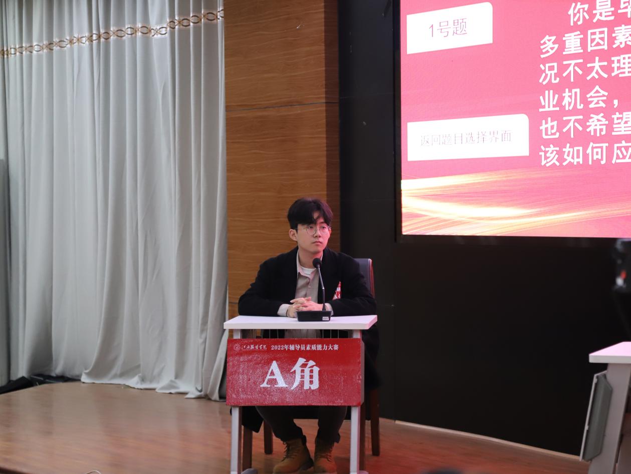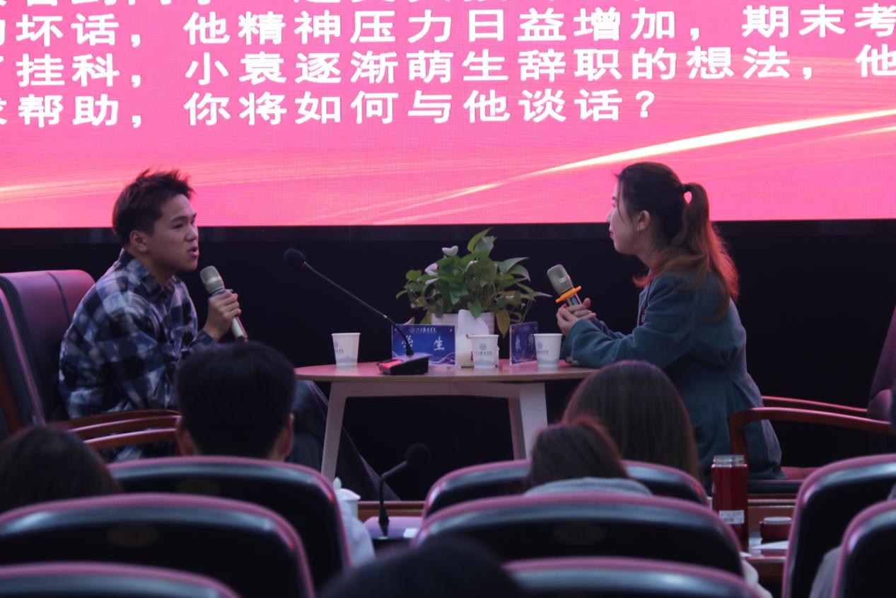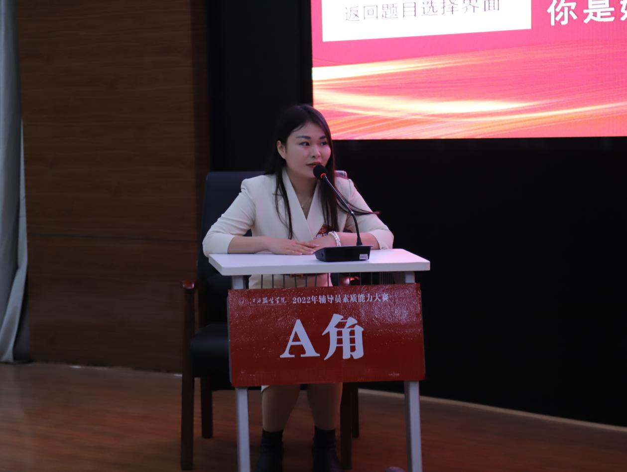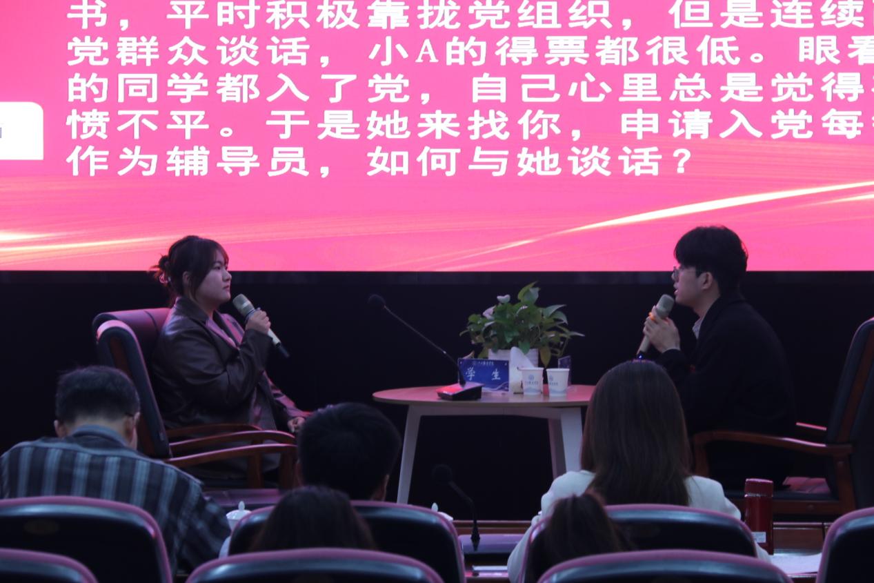 谈心谈话,主要考察辅导员对学生特征、学生成长成才规律的了解把握程度,对学生的教育引导能力、解决理论困惑和实际问题的能力等。参赛选手提前10分钟抽题,按照“人题匹配”的原则与学生开展谈心谈话。12位选手分别围绕情感困惑、疫情防控、学业压力、电信诈骗、党员发展、宿舍人际关系等话题与学生开展谈话,老师们充分运用心理学、教育学、职业发展教育等专业知识及自身工作经验进行价值引领,充分展示了辅导员扎实的政策把握能力、全面的信息分析能力与过硬的教育引导能力。比赛现场学生化身“戏精演员”,学生与老师金句频出,不时引出阵阵笑声,为比赛增添了欢乐性和趣味性。