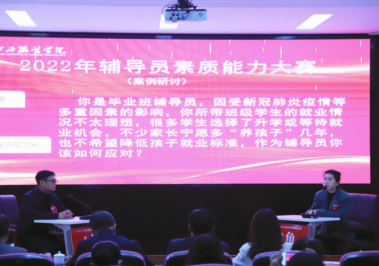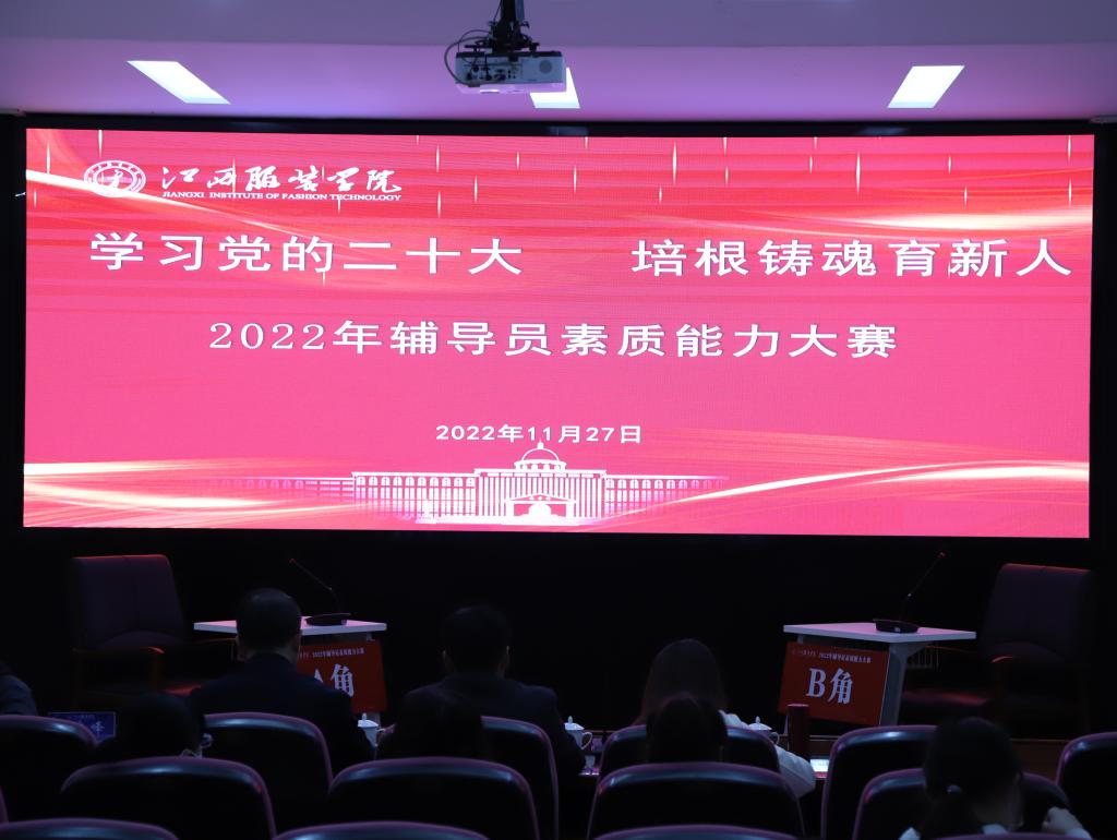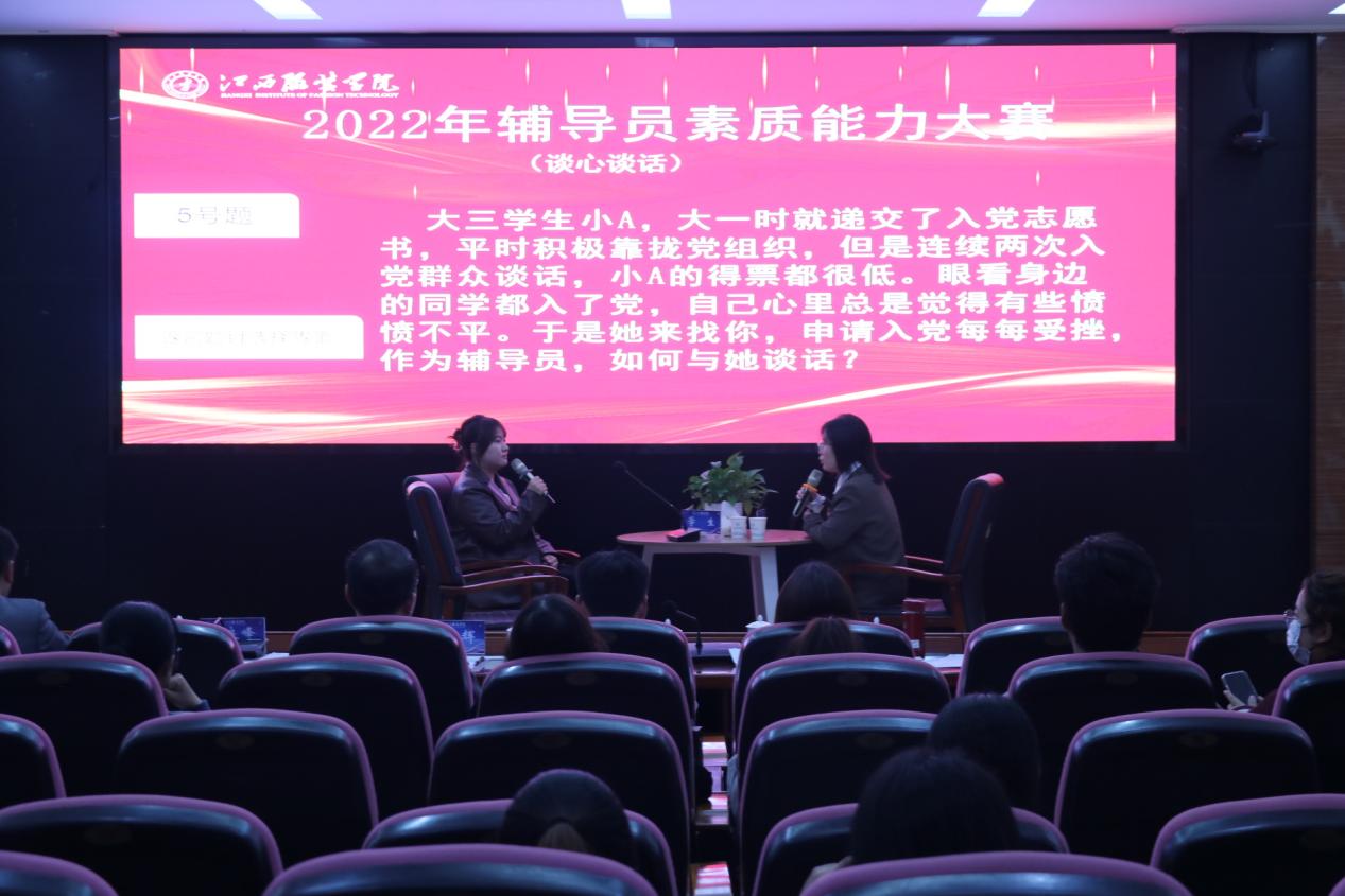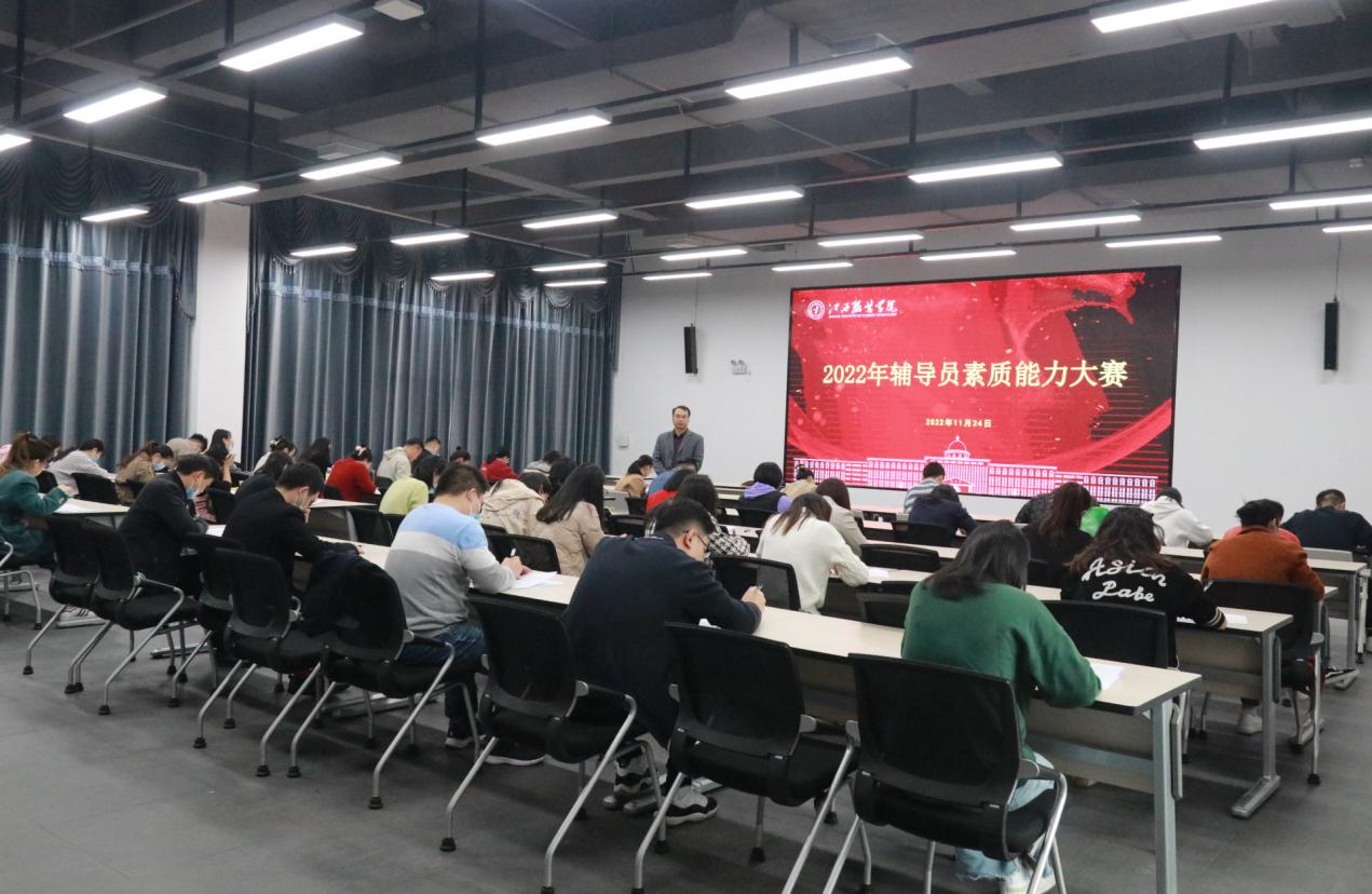 新闻中心讯(文/学工处 刘俭莲 图/胡鼎柱)为提升我校辅导员的理论水平、职业能力和专业素养,通过以赛促学、以赛促建,进一步推进我校辅导员队伍职业化、专业化、专家化发展,11月24日,我校举办2022年辅导员素质能力大赛初赛(基础知识测试),学校辅导员全员参与,通过“大练兵”全方位考核辅导员业务基本功,通过基础知识测试,共有12位选手进入决赛环节。27日,决赛(案例研讨)和(谈心谈话)在行政楼一楼报告厅顺利举行。江西师范大学商学院党委书记应露晨,南昌大学经济管理学院党委副书记吴金辉,第八届全国高校辅导员素质能力大赛一等奖获得者、江西师范大学美术学院团委副书记胡园慧,万象城平台党委学生工作部部长邓良峰担任评委;校党委副书记唐新强、各学院党总支(副)书记,全体辅导员及部分学生代表全程观摩比赛。决赛由学工处思政科副科长刘检莲主持。