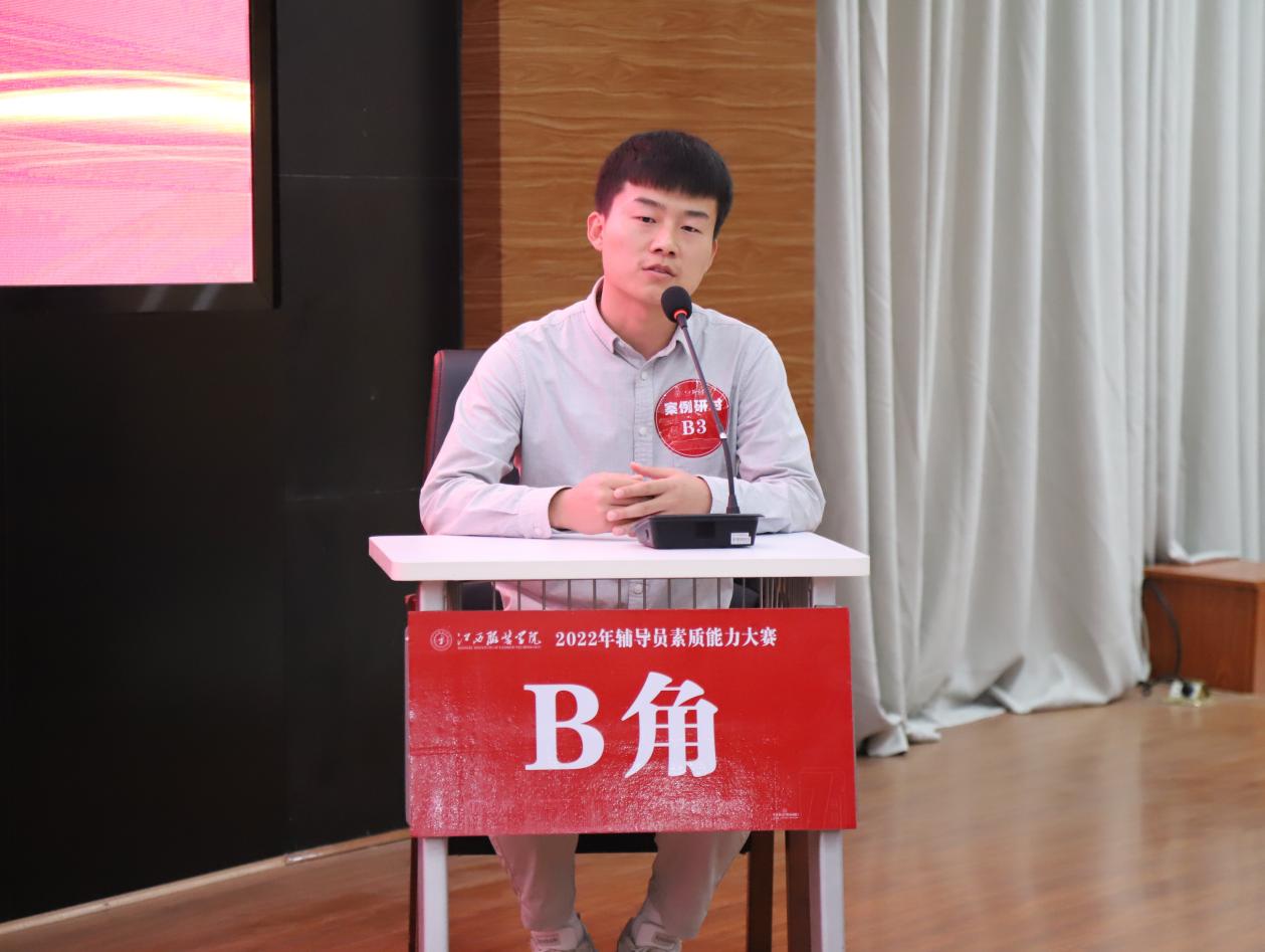 案例研讨,主要考察辅导员综合运用理论分析问题、研判问题、解决问题、应急处突等能力。选手在赛前抽取AB角签位,赛前10分钟分别抽取1道案例。比赛以“我提问,你回答”的方式开展,由AB选手围绕案例共同辨析原因、研讨对策、总结规律。6组选手既是对手、又是辩手,围绕“疫情防控”、“就业创业”、“理想信念”、“党员发展”“网络舆情”、“心理危机”、“宗教信仰” 等主题,选手们以饱满的精神状态和流畅的语言表达,在案例研讨环节剖析问题本质,探求解决思路,提出实施办法,彰显育人理念,充分展示了我校辅导员扎实的职业功底。