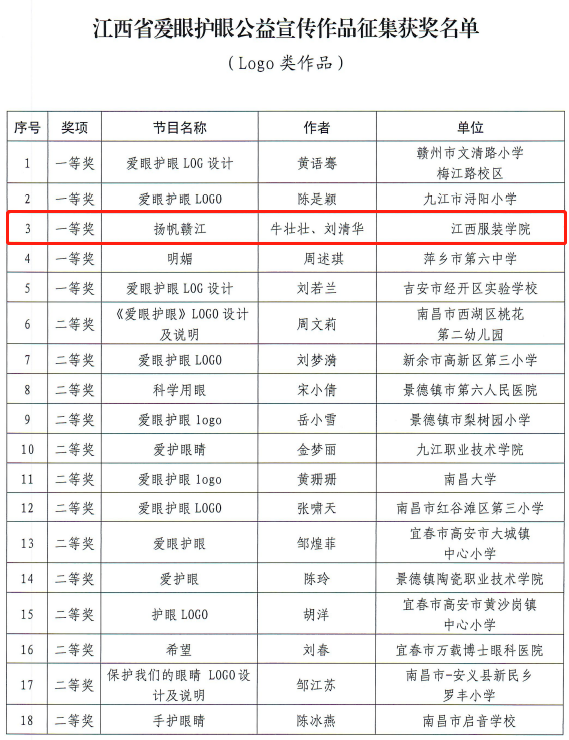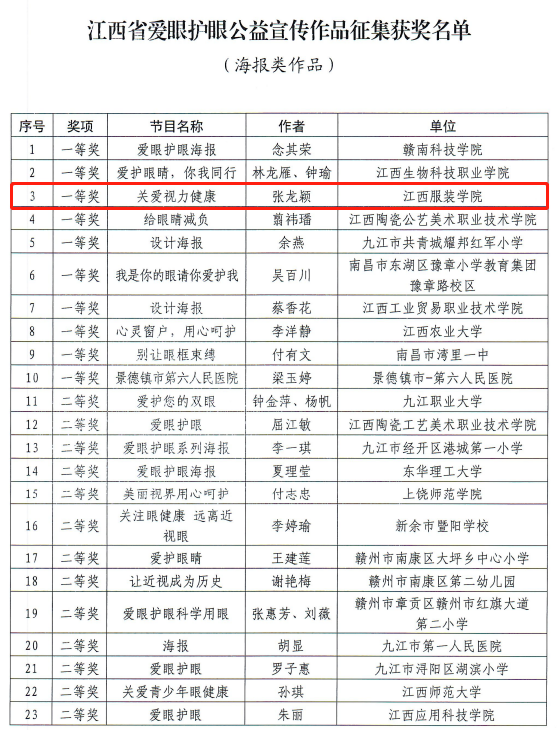 新闻中心讯 为深入贯彻习近平总书记关于儿童青少年近视问题的重要指示精神,全面落实教育部等八部门《综合防控儿童青少年近视实施方案》,进一步营造近视防控宣传教育氛围,根据《关于开展爱眼护眼公益宣传作品征集的通知》(赣教体艺字[2021]11号)安排,省教育厅、省卫生健康委员会开展了爱眼护眼公益宣传作品征集活动。我校师生作品在本次活动中获佳绩,其中张龙颖的作品《关爱视力健康》荣获海报类一等奖,牛壮壮、刘清华的作品《扬帆赣江》荣获LOGO类作品一等奖,华教胜的作品《保护双眼》荣获LOGO类作品三等奖。