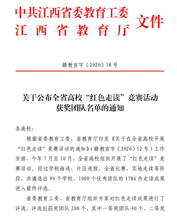 据悉,今年7月至10月,全省高校“红色走读”竞赛活动经过学校海选、片区选拔、全省比赛、实地走读等阶段,共遴选出99个学校、1000个优秀团队的1786件走读成果进入最终评选。11月,省委教育工委、省教育厅组织专家对红色走读成果进行了评选,评选出获奖团队200个,其中一等奖团队40个,二等奖团队60个,三等奖团队100个。下一步,省委教育工委、省教育厅还将对获奖的200个团队予以表彰,并举办“江西高校青年大学生红色文化论坛”和“江西高校红色文化主题艺术作品巡回展”,并启动“江西高校红色文化主题艺术作品网上展播”和“我为江西红色文化打 Call”活动。