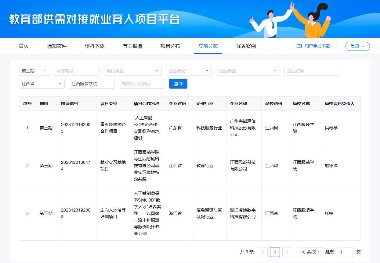 教育部高校学生司第三期供需对接就业育人项目是教育部为贯彻落实党中央、国务院关于高校毕业创业工作的决策部署,进一步深化产教融合、校企合作,健全完善校企协同育人机制,推动人才培养与就业有机联动、人才供需有效对接的重要举措。根据申报要求,经高校与用人单位联合申报、专家审核、公示等环节,我校共有3个项目获批立项。其中,重点领域校企合作项目1项,就业实习基地项目1项,定向人才培养培训项目1项。