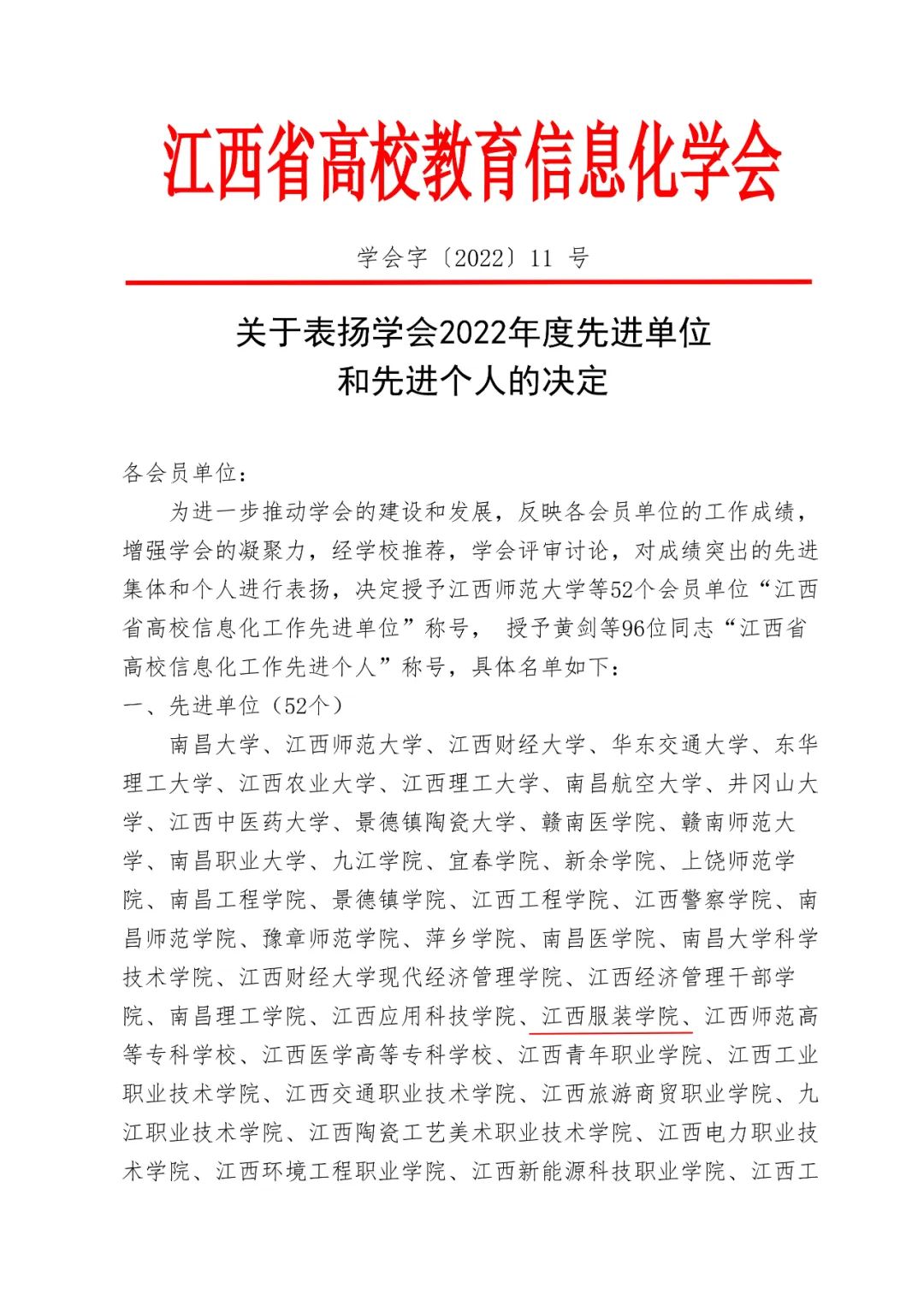 新闻中心讯(网络与信息化管理中心供稿)为促进高校信息化领域合作与交流,进一步推动信息技术与教育教学深度融合,2022年12月3日,江西省高校教育信息化学会经过评审讨论,对本年度工作成绩突出的单位和个人进行了表彰,我校荣获“先进单位”称号,郭敦、宁晋华荣获“先进个人”称号。这不仅是对我校信息化工作的高度肯定,也为我校进一步工作提供了动力。