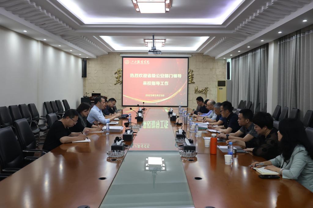 新闻中心讯(图/文 万强)5月23日下午,江西省公安厅副主任汤谨、政委熊星屏等省市县公安机关领导一行8人莅临我校调研指导。校党委副书记唐新强陪同调研,校党委宣传部、学工部、保卫处、国际交流与合作处等职能部门负责人参加调研座谈会。