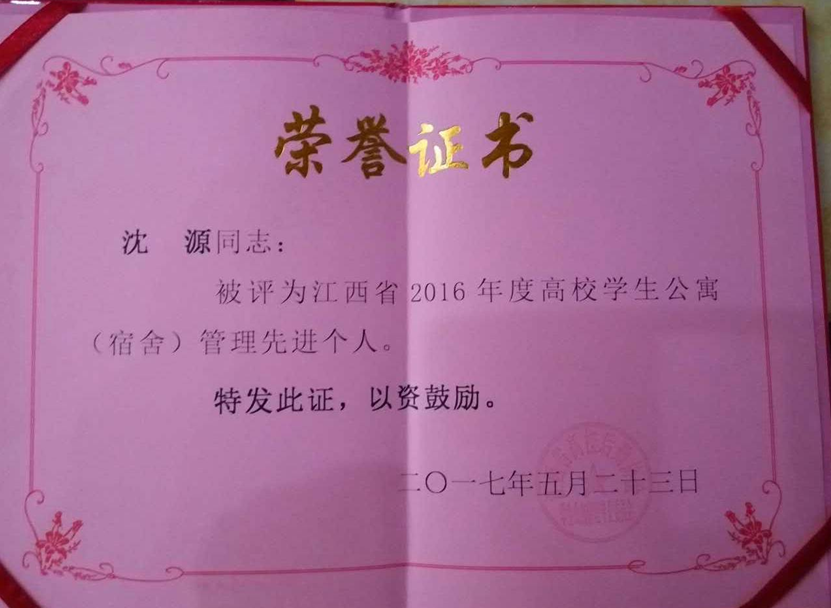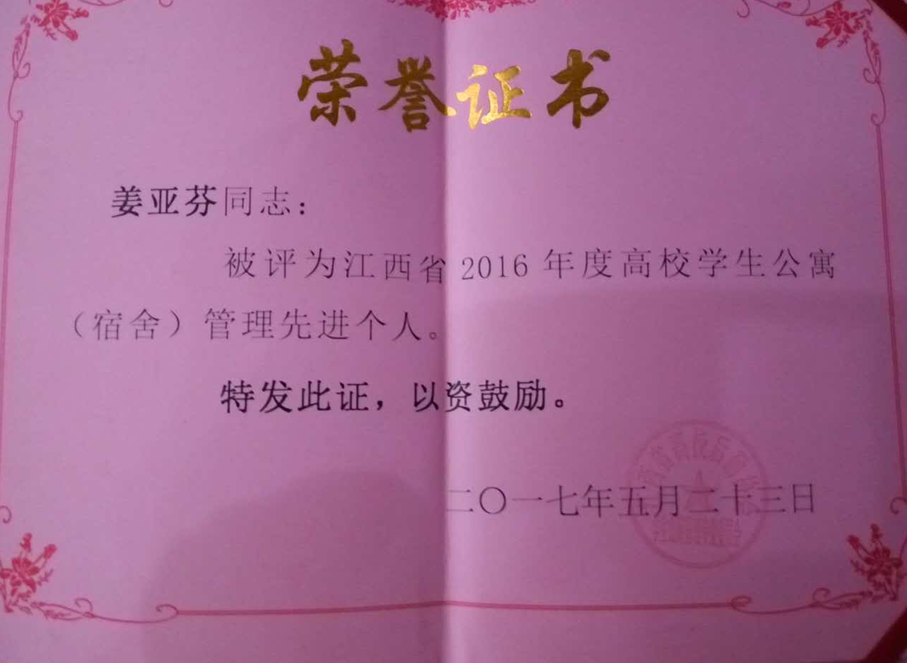 根据《关于表彰2016年度江西省高校学生公寓(宿舍)管理先进单位和先进个人的决定》(赣寓专委2017[4]号文),我校获2016年学生公寓管理工作“先进单位”,沈源和姜亚芬两位宿管老师荣获“先进个人”荣誉称号,这是我校第二次荣获此项荣誉。
