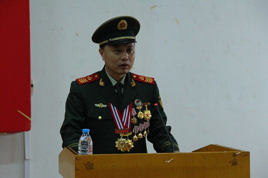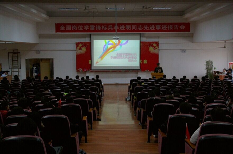 全国学雷锋标兵李进明同志做了关于《当兵就要像雷锋同志那样当个好兵》的先进事迹报告。李进明同志作为一名优秀的共产党员,先后荣立一等功1次,二等功1次,三等功4次,7次被评选为优秀共产党员,被授予“中国武警十大忠诚卫士”荣誉称号等等。他常对自己说,当兵要当个好兵,听党的话,服从组织安排。当个人意愿和组织需要发生冲突时,必须把组织需要放在首位。 他一直把当一名合格的通信兵作为自己的不懈追求。看专业书籍自学维修技术,咬牙卖掉参军时父亲送他的手表买维修设备,多次试验、论证研制出简便、灵敏的报警器。当兵28年间,攻读700多册电子和网络工程方面的书,有20多项技术成果被上级推广使用。他认为作为一名武警,无论是支队领导,还是一名战士,心里装的是人民群众,时刻要想到为人民服务。他们经常上街开展便民活动,在军营,把自己掌握的知识交给新兵。婚后第三天接到调令到总队通讯集训队当教官,父亲心脏病住院,一连接到三次病危通知书,仍然坚持到工程结束才请假回家。在得大细胞淋巴癌化疗期间,李进明同志仍不放弃自己的工作,他把设备当做自己的孩子一样细心照顾。他说他将自己最宝贵的青春奉献给了国家,今后,也将继续用勤奋回报荣誉,用坚守战胜困难,用乐观笑对病魔,永远做一名党和人民的忠诚卫士。