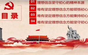 再次,唯有坚定理想信念方能秉持初心。此方面共从四个角度论述,分别是光芒在最困难时迸发出来、秉持初心并非易事、坚定理想信念是对党坚贞不屈,坚如磐石的革命气节以及坚定理想信念是排除万难为党和人民牺牲一切的忘我精神。
