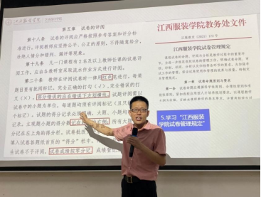 会上,何治国首先带领全体教师共同学习《万象城平台试卷管理规定》,细致解读了期末试卷批阅工作的要求规范。其次,向全体教师展示不规范阅卷的案例,强调了试卷评阅过程中的注意事项,例如分数计算要准确并且小分累计要和总分对应,课程达成度分析要与课程目标保持一致,试卷、试卷袋等都要有相关老师签名并且所有签名必须与课表保持一致。何治国指出,期末试卷评阅工作十分关键,各位评阅教师本着对教学工作负责的态度,严格按照学校下发的试卷评阅规范的通知,认真细致阅读、高质量完成期末评卷相关工作。