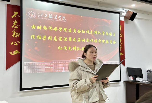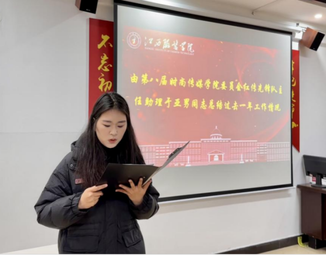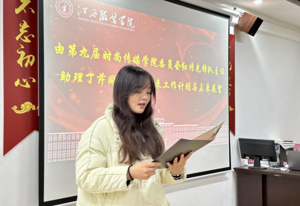 按照会议流程,第八届时尚传媒学院委员会红传先锋队执行副主任潘韦宇同志,主任助理于亚男同志分别总结过去一年党建各部门工作情况及存在的问题和不足,并鼓励各位学生骨干要勤奋学习长才干,勇于创新敢于争先,坚定信念担责任,积极为学生工作事业添砖加瓦,为学院发展增添光彩。同时,时尚传媒学院委员会红传先锋队常务副主任杨丹同志宣读第九届时尚传媒学院委员会红传先锋队换届文件并对第八届时尚传媒学院委员会红传先锋队的贡献表达了感谢及认可,并祝贺新一届的学生骨干顺利任职。