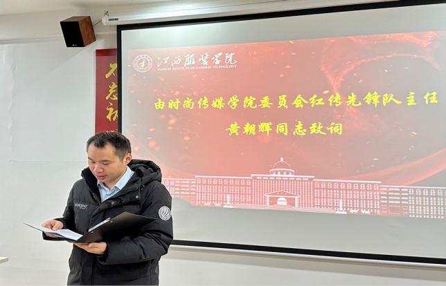 会议伊始,由时尚传媒学院党委副书记黄朝辉同志致词,他首先对红传先锋队各部门辛勤的工作给予充分的肯定和认可。在过去的一年里,各部门取得了许多重要成绩,使时尚传媒学院思想政治教育得到深入开展。同时,希望加入党建的新生们能够弘扬“奉献、友爱、互助、进步”的志愿服务精神,成为时尚传媒学院的先锋军,用自己的实际行动彰显青年人的蓬勃朝气,为时尚传媒学院的发展贡献自己的一份力量。