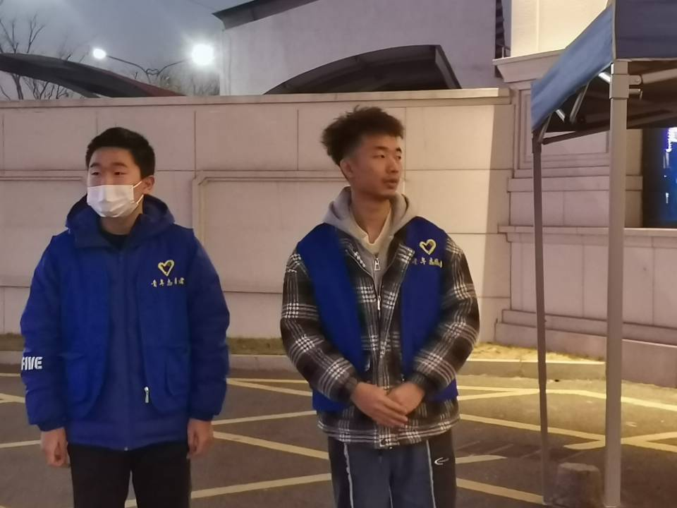 当日晚上的天气寒冷,但是这并没有减退志愿者们投身社会志愿服务的热情。参加志愿服务的同学们,统一穿着干净整洁的蓝色马甲,按时到达2号门门口,在保卫处同志的指导下,志愿者们对学生进行提示扫码、体温检测,维护正常秩序,监督学生正确规范佩戴口罩,引导学生保持有效间距。他们不惧严寒,始终坚守岗位,用自己的实际行动,诠释了“党有号召,团有行动”的责任与担当。
