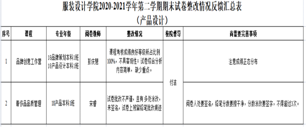 (服装设计学院 撰稿:钟兴)为积极构建自觉、自省、自律、自查、自纠的学院质量文化,建立健全特色的本科教育教学质量保障体系,进一步提升教学质量管理的主体意识和责任意识,以严格考试管理环节、规范考试行为为抓手,服装设计学院于2021年10月20-22日,组织上学期期末试卷整改专项检查工作。