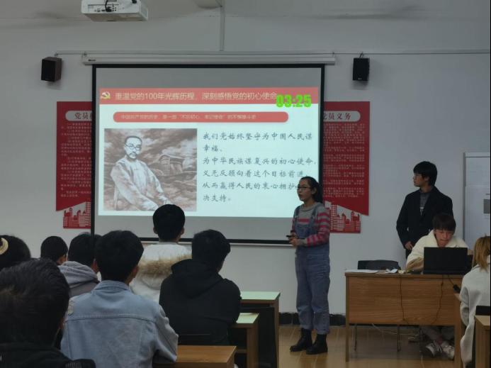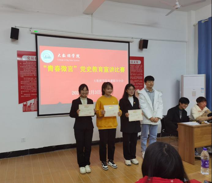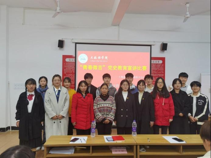 传承红色基因,展现青年风采、彰显使命担当,弘扬正确党史观,大数据学院学生党支部2021年12月3日17:00在清河11栋大数据学院党员活动室举办“江服青年讲党史”宣讲比赛。本次宣讲比赛由大数据学院党总支部书记王春梅、学生党支部书记周文琴、党支部宣传委员王前坤担任教师评委,大数据学院学生党支部执行副主任叶朝霞、学习部部长张字骏担任学生评委,参与人员为大数据学院部分学生。