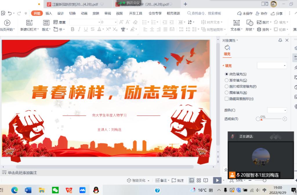 服装工程学院讯(撰稿:沈思怡)为深入宣传大学生先进典型,展现优秀学生的精神风貌,促进大学生向榜样看齐,增强奋发向上精神,营造大学生比、学、赶、帮的良好氛围,4月29日晚7:00时,服装工程学院组织各班级以《青春榜样,励志笃行》为主题召开了线上班会。