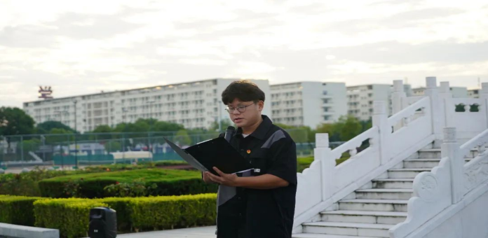 清晨七时整,第一项升国旗仪式正式开始。国旗护卫队的同学们迈着整齐划一、铿锵有力的步伐,正步护送五星红旗走向旗杆。随着庄严肃穆的《义勇军进行曲》响起,五星红旗冉冉升起,在熠熠晨光中迎风飘扬。升旗仪式结束后,由马顺同学作为学生代表上台发言,激励23级全体新生明白青春的意义和明确自身的使命。青春奋进正当时,不负韶华争朝夕。新时代青年要在担当中历练,在尽责中成长,让青春在追梦的奋斗中升华!