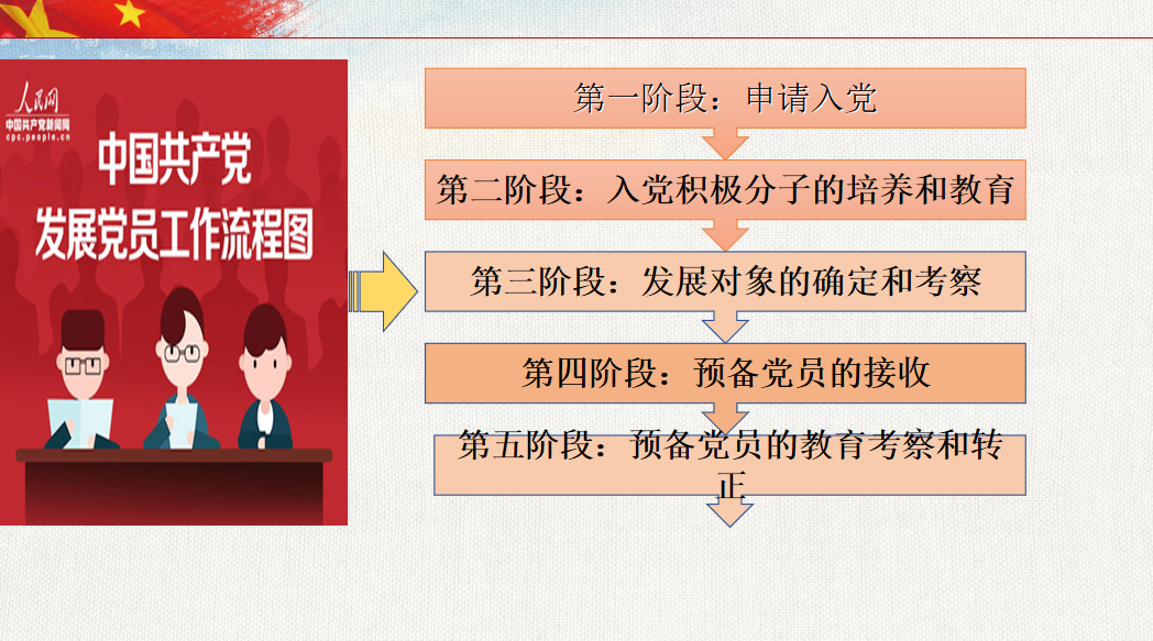 紧接着,陈翠娥老师着重讲解了发展党员工作流程主要的五个阶段,分别是申请入党;入党积极分子的培养和教育;发展对象的确定和考察;预备党员的接收;预备党员的教育考察和转正。在讲解过程中,陈翠娥老师多次强调,发展党员要严格按照标准进行,必须认真对待,过程严谨,争取吸收拥有较高的思想觉悟和能切实的为人民服务的发展的对象。