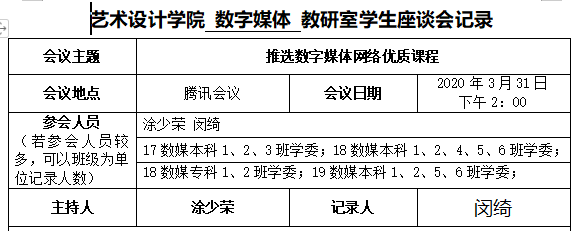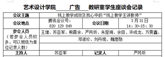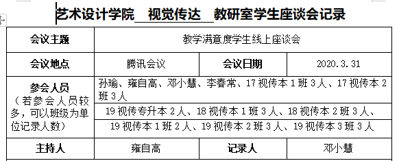 3月30日,艺术设计学院质量监测与评估小组发布了各专业开展“线上教学满意度”师生座谈会的通知。