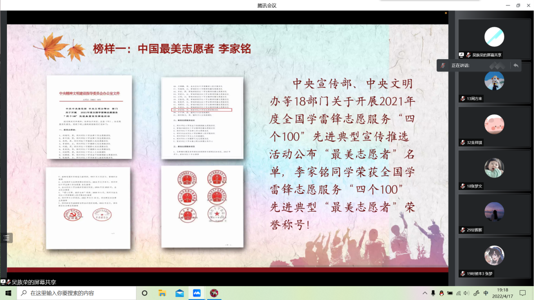 为建设良好的校园学风,引领我院同学向青春榜样学习,从而实现青春梦想。4月17日晚19时,服装设计学院各班级在腾讯会议平台召开了“学习身边好榜样,弘扬青春正能量”的主题班会思政课。