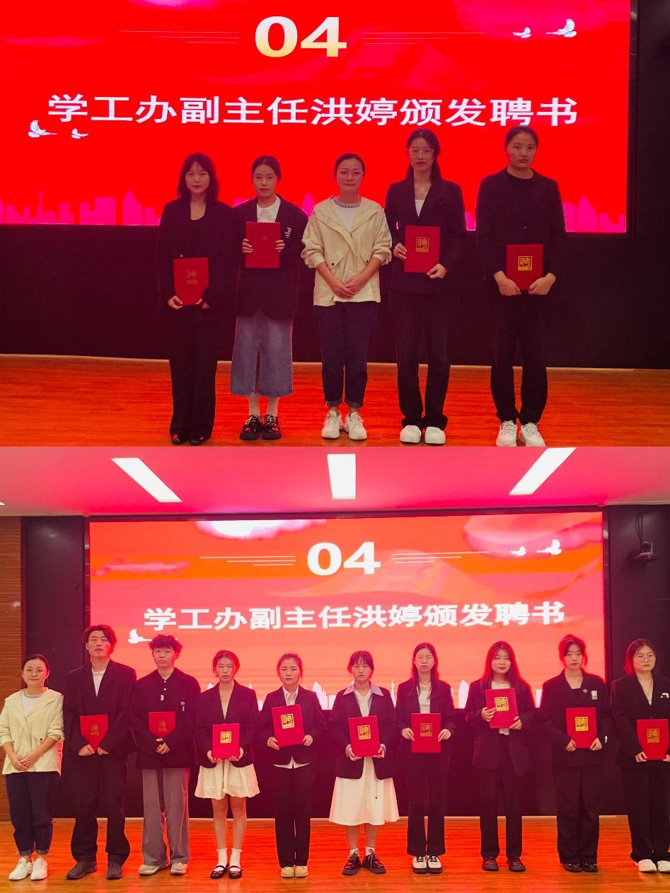 大会第四项,由学工办副主任洪婷宣读服装工程学院第二届班委联合会任职通知并颁发聘书。