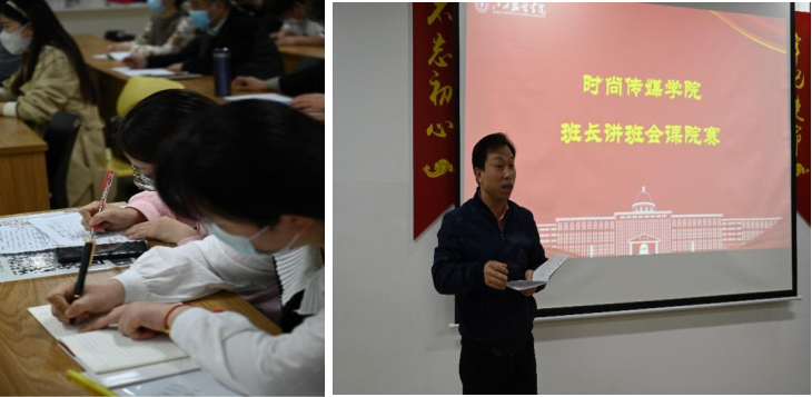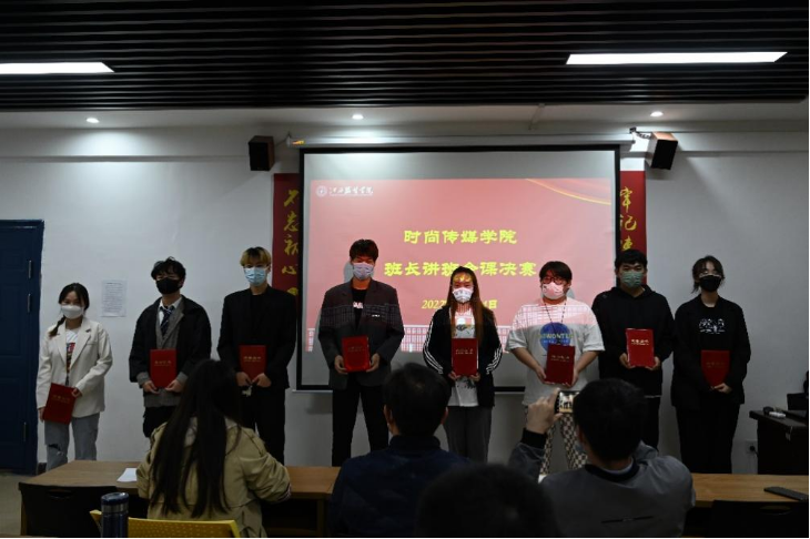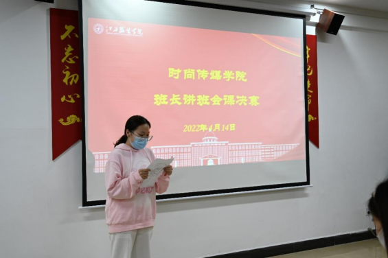 班长作为开展学生管理工作的主要力量,在学生群体中能够发挥桥梁作用,带头作用,是我校素质教育中不容忽视的重要组成部分。为了使班长充分发挥个人专长,创新管理模式,助力班级成长。时尚传媒学院于2022年4月14日19:00在艺术楼430开展 “班长讲主题班会课”复赛。参加活动的领导老师有,时尚传媒学院党总支副书记黄朝辉,学院院长助理阳石刚,学工处老师吴小芳,学工办副主任成为家,学生支部书记康艳红,以及辅导员范培培、魏峙东、田露婷、龚俊敏等老师。