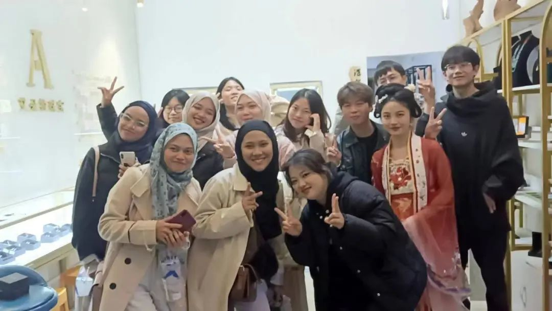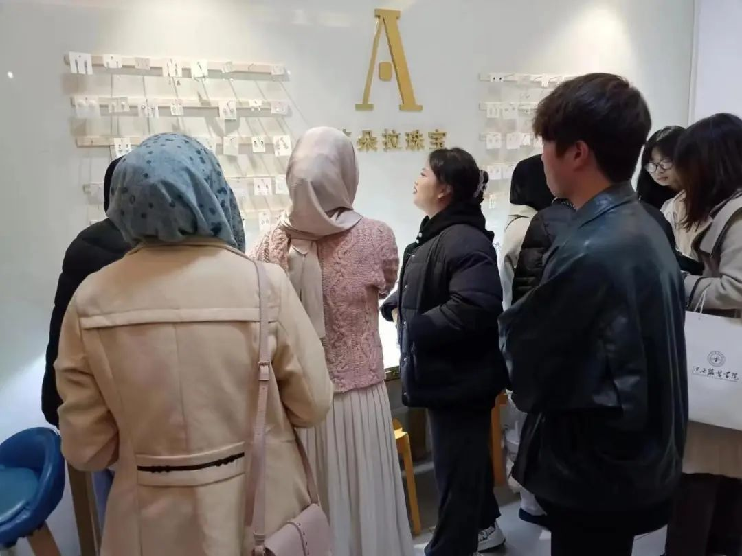 2023年11月19日,贝茜妮·2023江服国际时尚艺术周期间,深然珠宝店迎来了一批特殊的顾客——马来西亚吉兰丹大学留学生,留学生们在翻译老师的带领下饶有兴致地参观珠宝店,挑选喜爱的饰品,深刻感受学校浓厚的学术氛围和学生的创新精神。