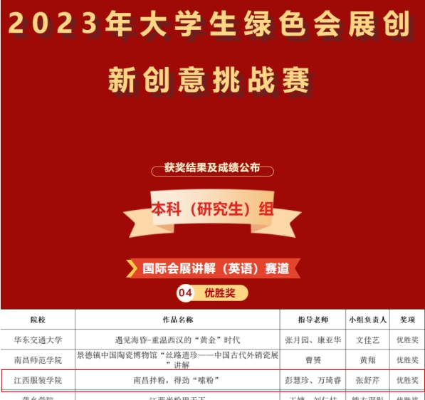 人文学院讯(陈家华撰稿)11月25日上午,第六届大学生绿色会展创新创意挑战赛落下帷幕,我校人文学院商务英语教师彭慧珍、万琦睿指导的22商务英语本科3班张舒芹、胡志霞同学喜获国际会展讲解(英语赛道)本科(研究生)组优胜奖。
