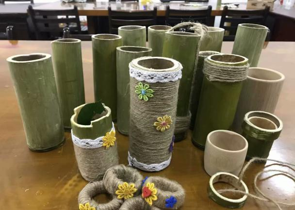 在活动过程中,每一个人都充分发挥自己的想象力和动手操作能力,有锯竹子的、有给竹子刨皮的、有打磨竹子的、有给竹筒装饰的……所有成员各展所能、分工合作。在所有人的努力下,将这些“平平无奇”的竹筒和麻绳等材料制作成别具匠心的手工作品。