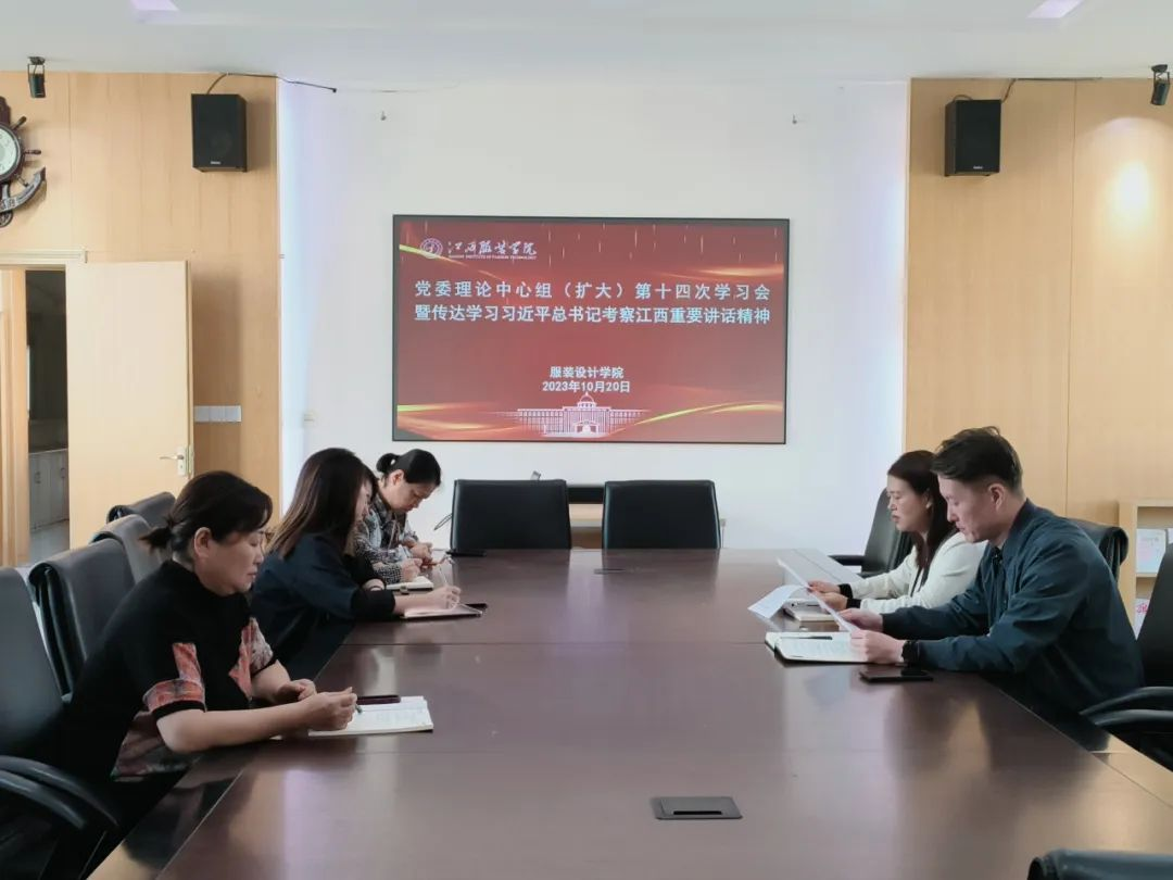 2023年10月20日下午,服装设计学院在清源一栋四楼学院会议室召开党委理论学习中心组(扩大)第十四次学习会,传达学习习近平总书记在江西考察时的重要讲话精神和习近平总书记在进一步推动长江经济带高质量发展座谈会上的重要讲话精神。学院党委书记蓝岚主持会议,学院党委委员,领导班子成员参会。