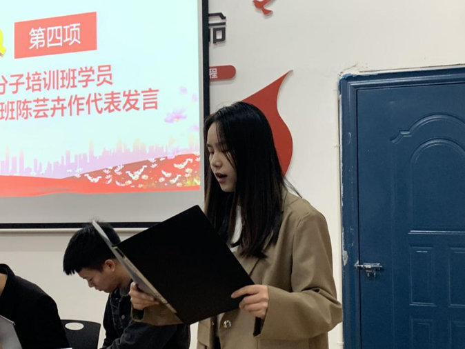 17服工本科3班陈芸卉同学代表本期参加培训的入党积极分子发言,端正学习态度,提高政治觉悟,端正入党动机。学员们将时刻遵守培训班安排和培训班管理规定,认真参加培训,并以饱满的热情去深入系统地学习党的知识,以主动积极的态度去完成党组织分配的任务。
