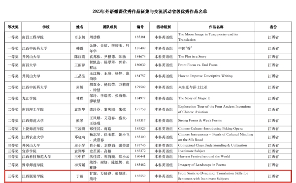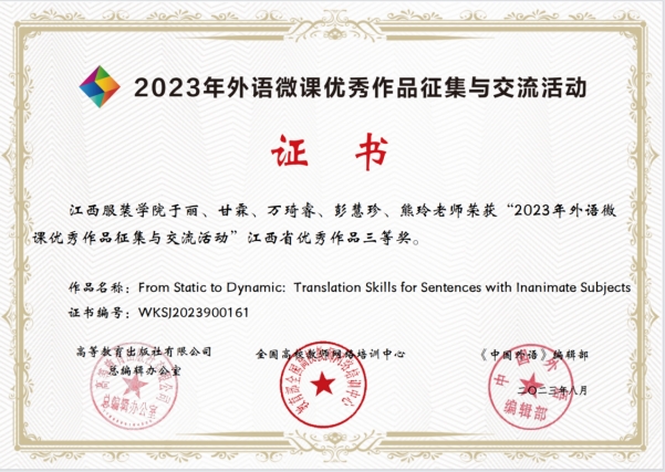 【人文学院讯于丽撰稿】2023年全国高等学校外语微课优秀作品征集与交流活动成绩近日揭晓。我院商务英语教研室于丽、甘霖、万琦睿、彭慧珍、熊玲团队的作品“From Static to Dynamic: Translation Skills for Sentences with Inanimate Subjects”荣获本科英语组江西省三等奖。