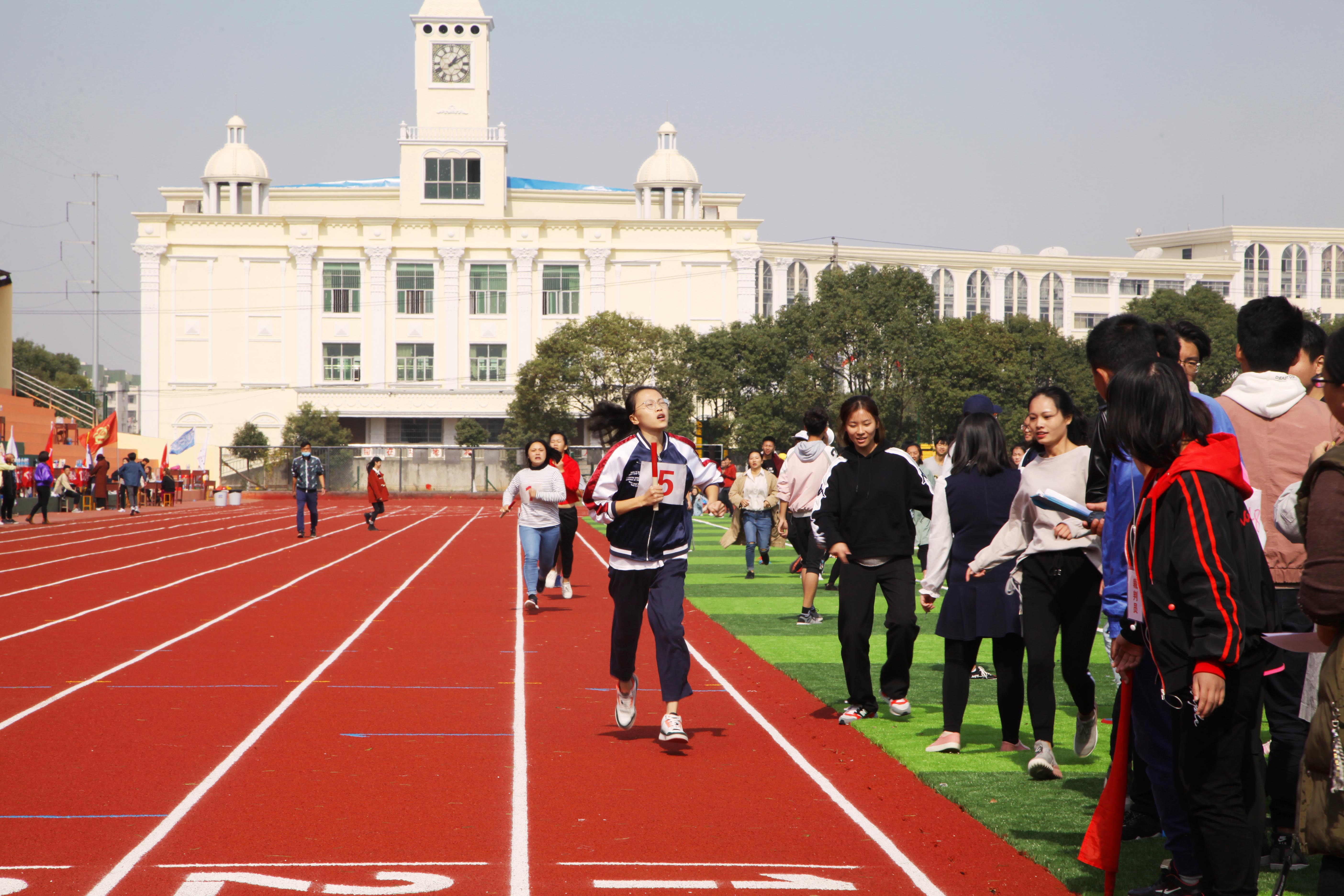 比赛场上,谁说女子都是巾帼英雄,时装5班的4位运动员在赛道上,完成一次一次的超越,迎来了最后的胜利。比赛中,刘欣瑜担任的是最后一棒的接力,但她接到接力棒的时候,落后其他赛道的人有那么一段距离了,她不顾腿上的伤,凭借意志力和奔跑技巧超越了前面的选手。“拿下了冠军,真的开心,好开心”刘欣瑜抑制不住内心的激动对记者说。