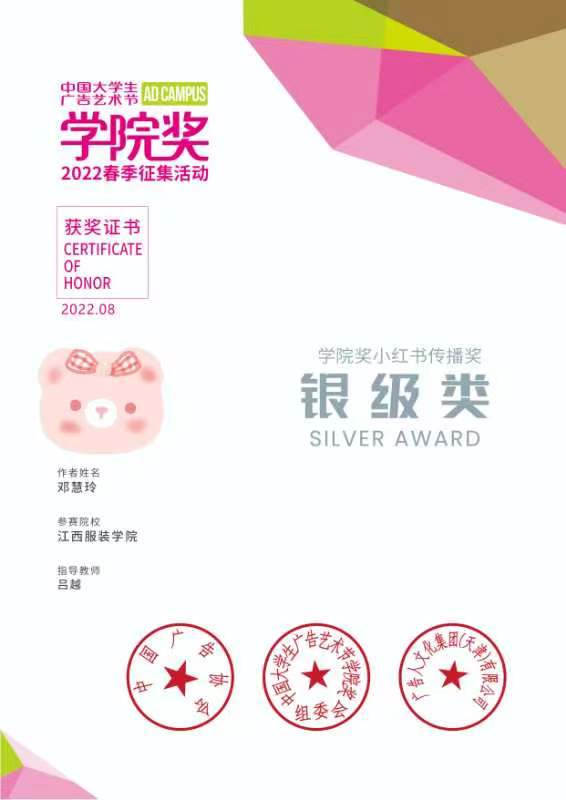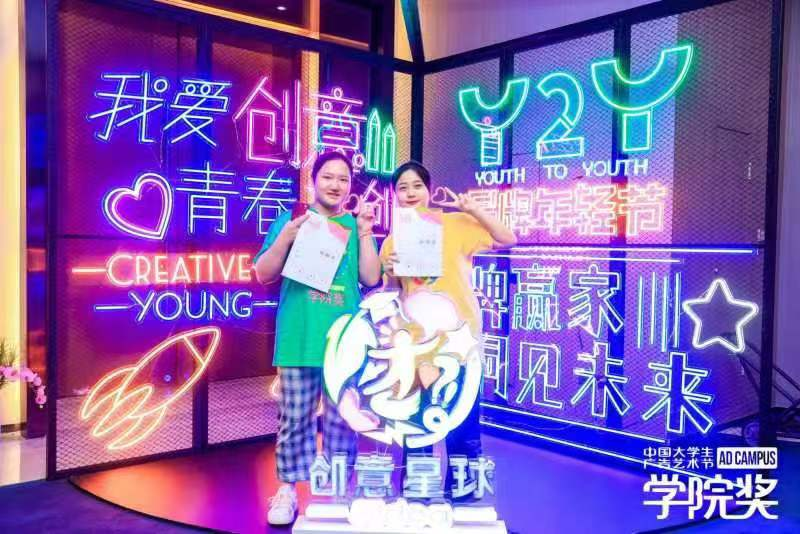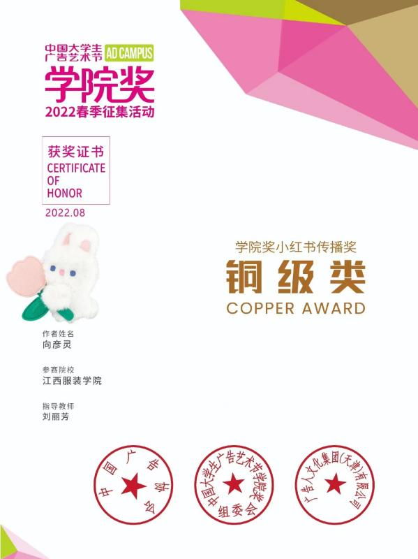 二、2022年8月17日,中国大学生广告节“学院奖”2022春季颁奖盛典在天津泛太平洋大酒店隆重举行。人文学院学子在本届大赛中斩获一银一铜佳绩,其中2020级网络与新媒体本科2班邓慧玲荣同学获小红书传播奖银奖,2020级网络与新媒体本科1班向彦灵同学荣获小红书传播奖铜奖。本次比赛获奖是人文学院网络与新媒体专业学生在新媒体传播赛道上首次发出了万象城平台的声音。
